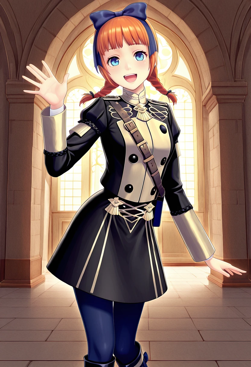 Trigger Words (Garreg Mach): SisterLionheart, blue eyes, orange hair, dark blue bow, twin braids, low twintails, garreg mach monastery uniform, black jacket, gold trim, puffy sleeves, long sleeves, black buttons, blue pouch, shoulder strap, black skirt, blue pantyhose, black boots, knee boots,