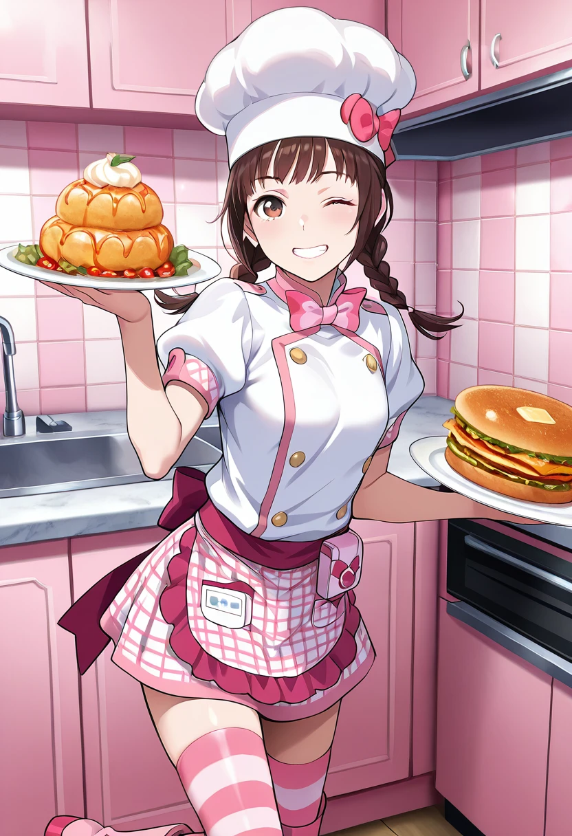 Trigger Words (Chef): MicrowavinApron, brown hair, brown eyes, chef hat, twin braids, low twintails, pink bow, white shirt, pink bowtie, short sleeves, puffy sleeves, waist apron, plaid apron, pink apron, white apron, apron pouch, pink miniskirt, zettai ryouiki, striped thighhighs, pink thighhighs, pink boots,