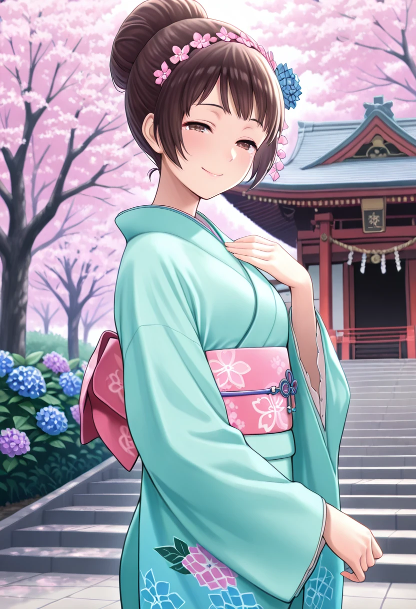 Trigger Words (Alternate Kimono): RainyHydrangea, brown hair, brown eyes, hair bun, flower hairband, flower hair ornament, aqua kimono, flower print kimono, pink obi, white tabi, blue sandals,