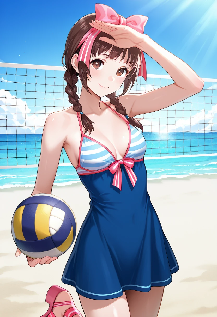 Trigger Words (Swimsuit): brown hair, brown eyes, pink bow, twin braids, low twintails, blue swimsuit, pink straps, striped top, front-tie bikini top, striped tie, blue dress, short dress, pink anklet, pink shoes, open-toe shoes, platform heels,