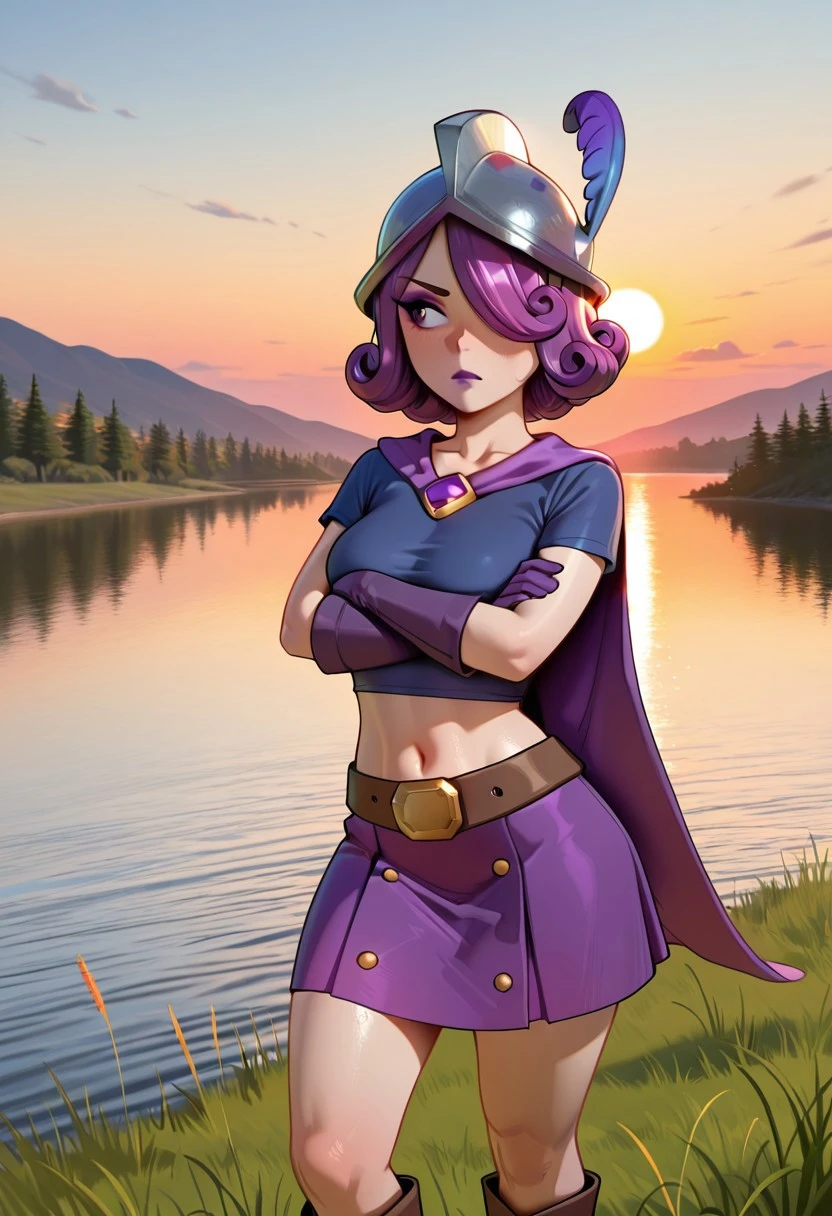 Prompts: EvoMsktCR, 1girl, solo, purple hair, hair over one eye, purple eyes, purple lips, lipstick, makeup, short sleeves, gloves, boots, belt, helmet, hat with a feather, cape