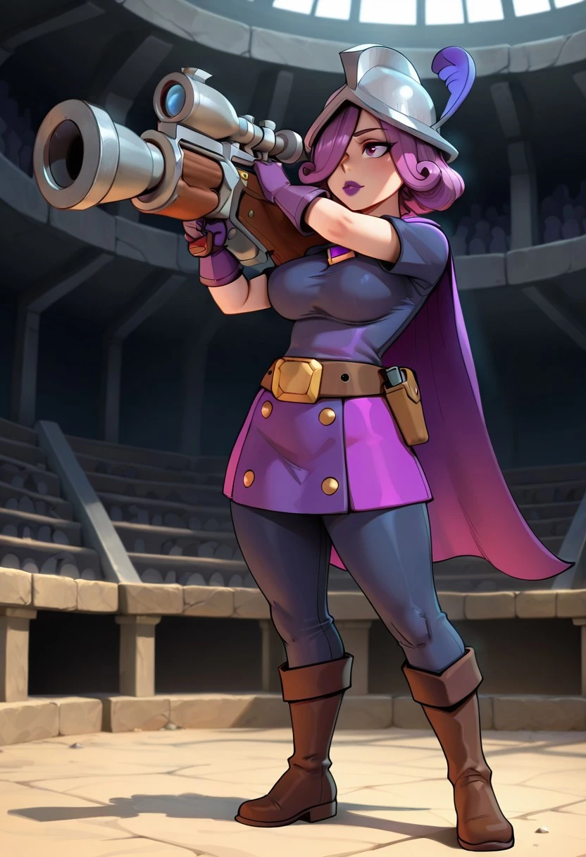 1girl, solo, purple hair, purple eyes, purple lips, lipstick, makeup, short sleeves, gloves, boots, belt, helmet, hat with a feather, cape