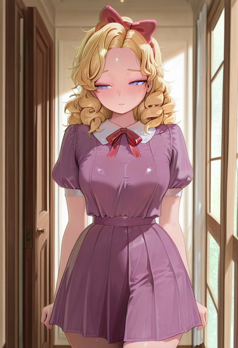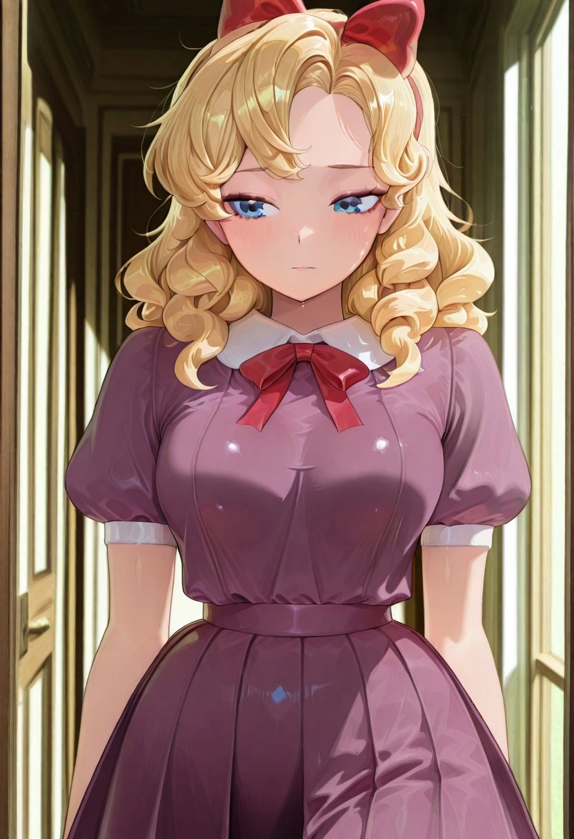 AD_Susie_(Fnaf), 1girl, solo, curly hair, blonde hair, long hair, bangs, hair bow, bow, hairband, bowtie, blue eyes, purple dress, short sleeves, puffy sleeves, red ribbon, neck ribbon, Medium Breasts, pleatrd skirt, blush, mature, adult