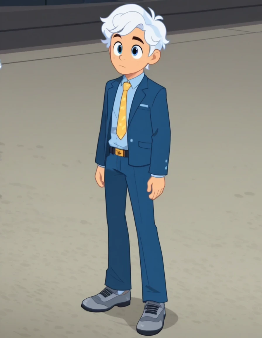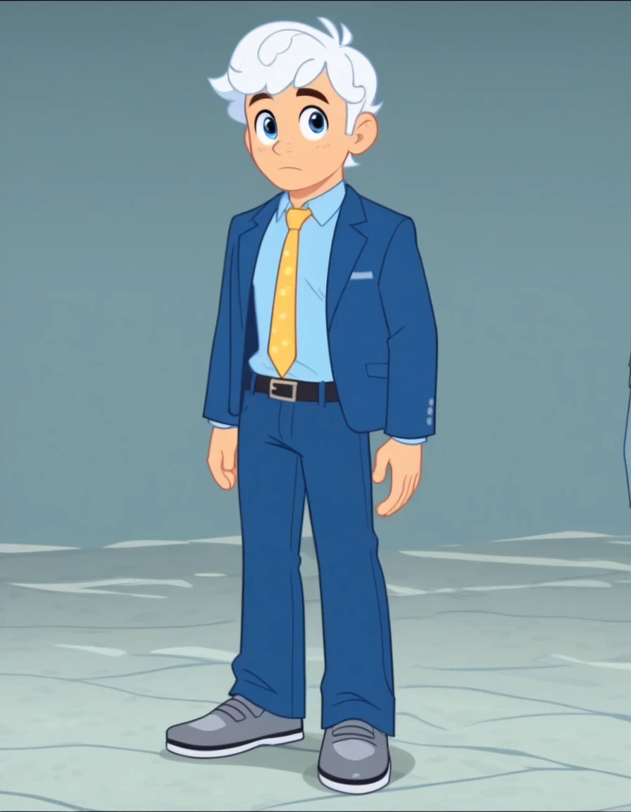 Steve_StaleburgerSML, blue eyes, shirt, long sleeves, 1boy, jacket, light blue shirt, white hair, necktie, belt, pants, open jacket, blue jacket, yellow necktie, gray shoes,