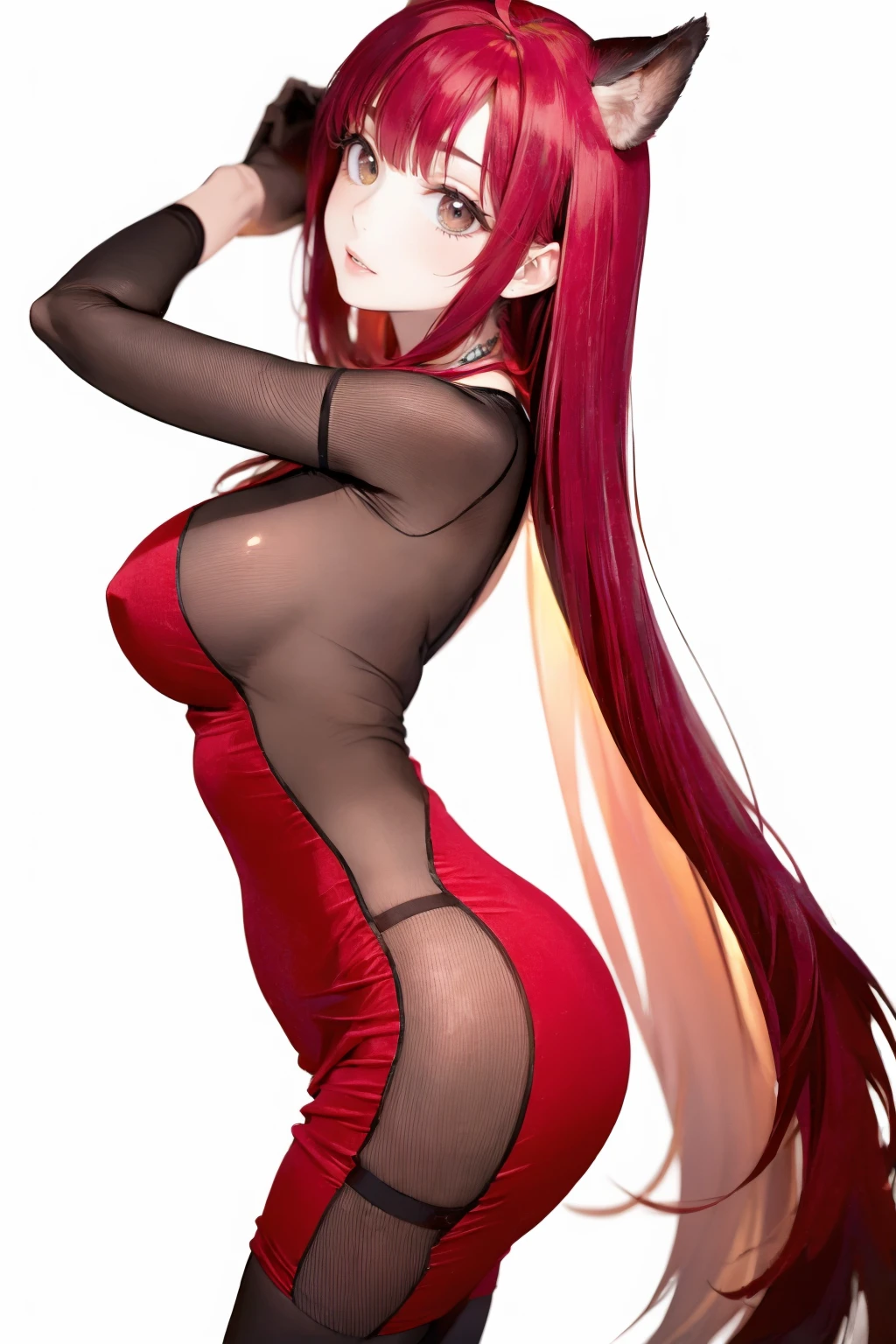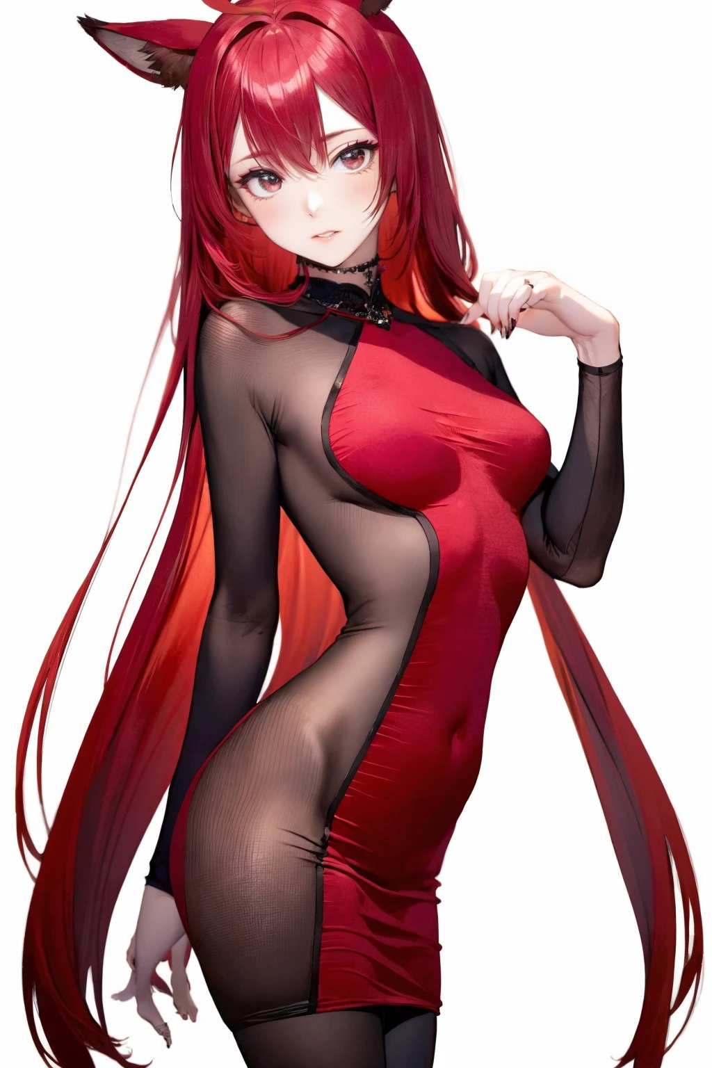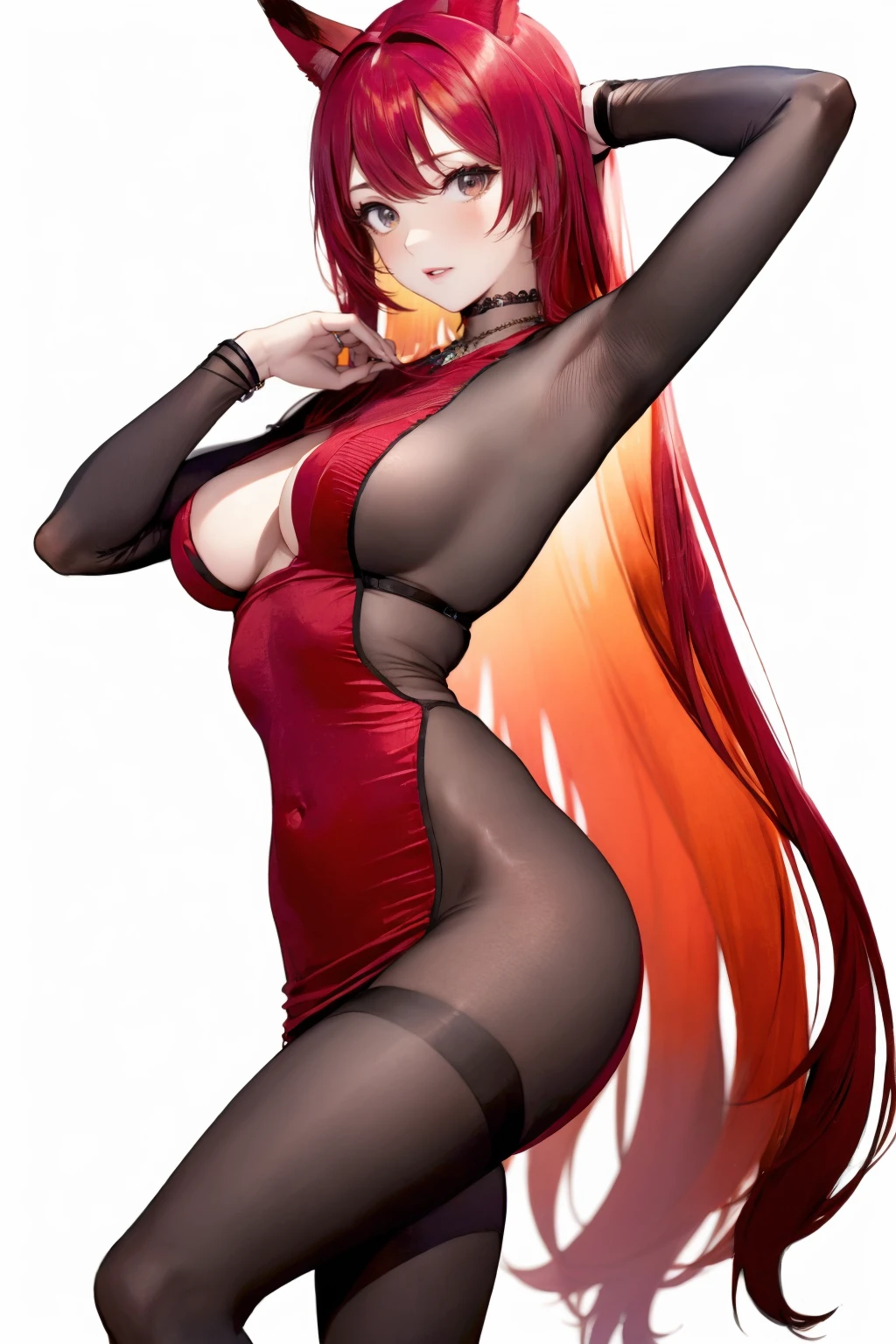 1girl,solo,jewelry,dress,necklace,red dress,breasts,high heels,pantyhose,see-through,