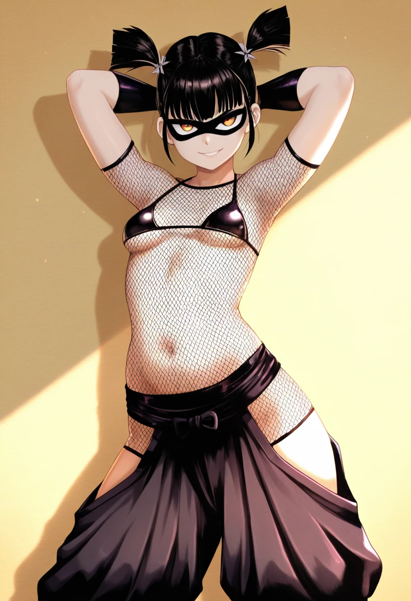 shadow_ring_opm, ninja, short twintails, small breasts, mask, fishnets, covered belly, dark bikini top, covered underboob, pantsDescription