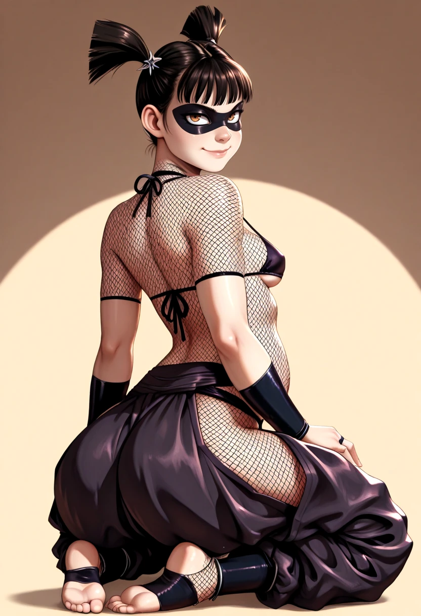 ninja, short twintails, small , mask, fishnets, covered belly, dark top, covered underboob,
