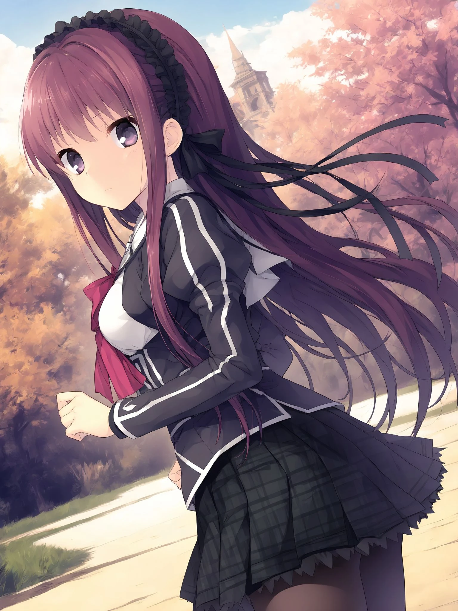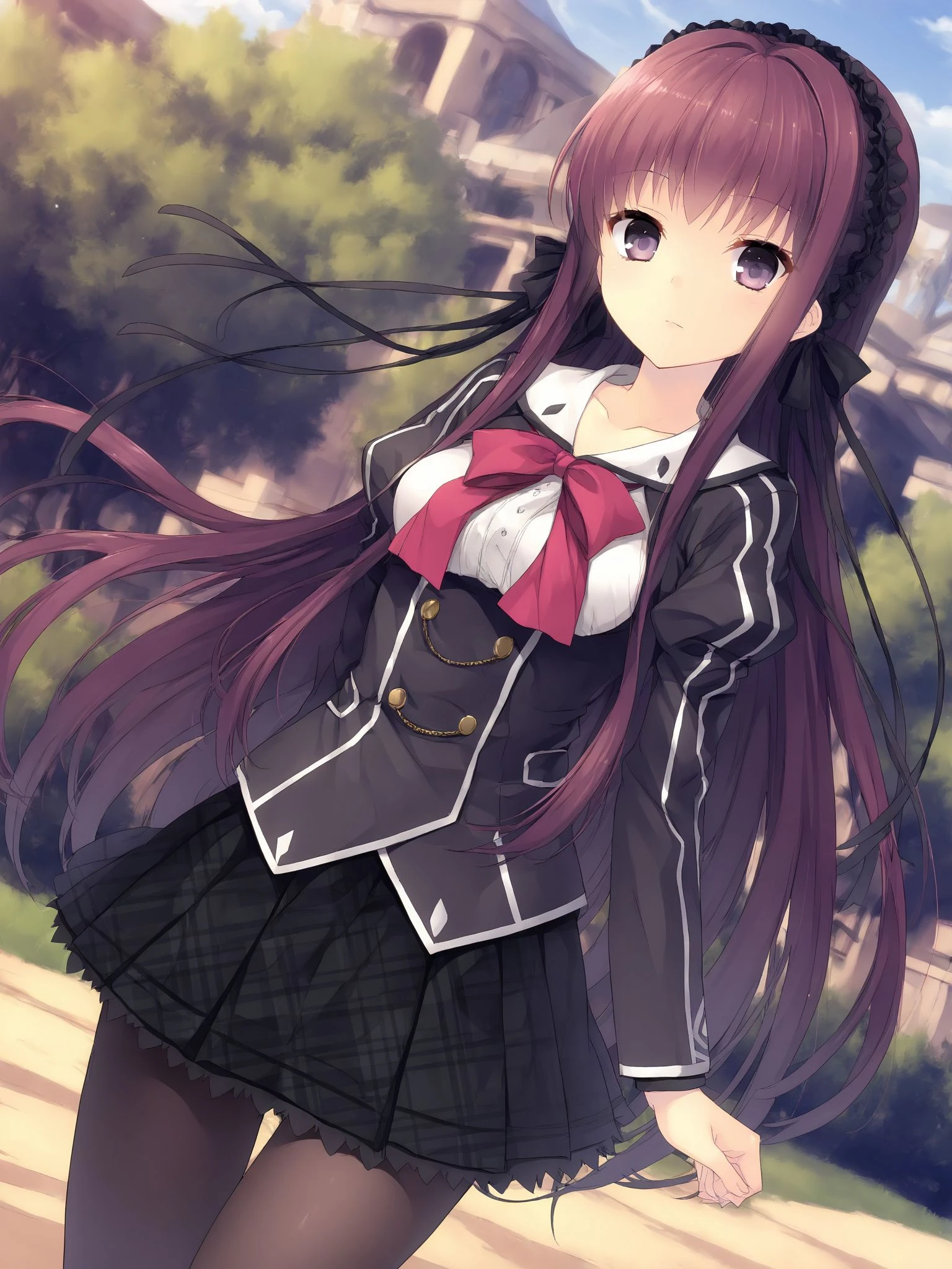 leylineushio,long hair,purple hair,brown hair,very long hair,purple eyes,hair ribbon,hairband,medium breasts,