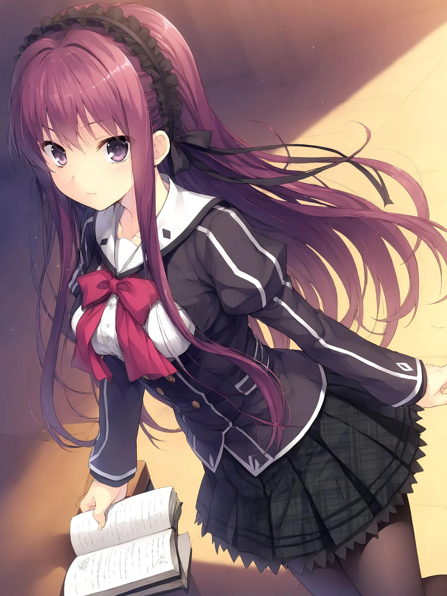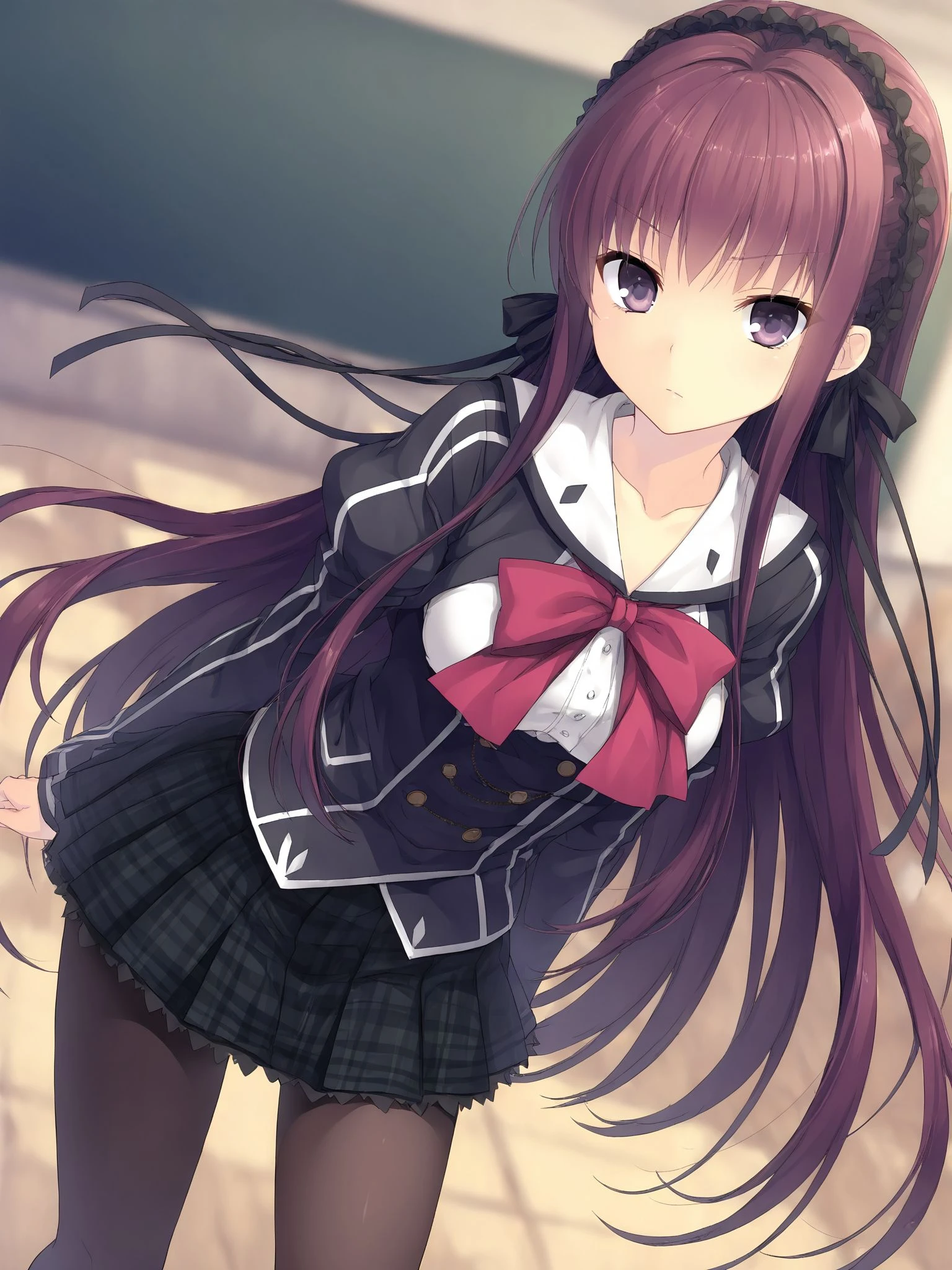 school uniform,puffy sleeves,long sleeves,bow,plaid skirt,pleated skirt,black pantyhose,