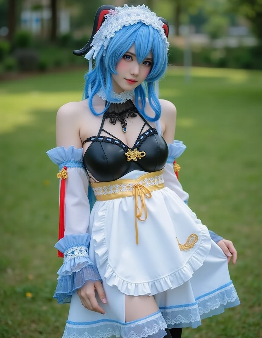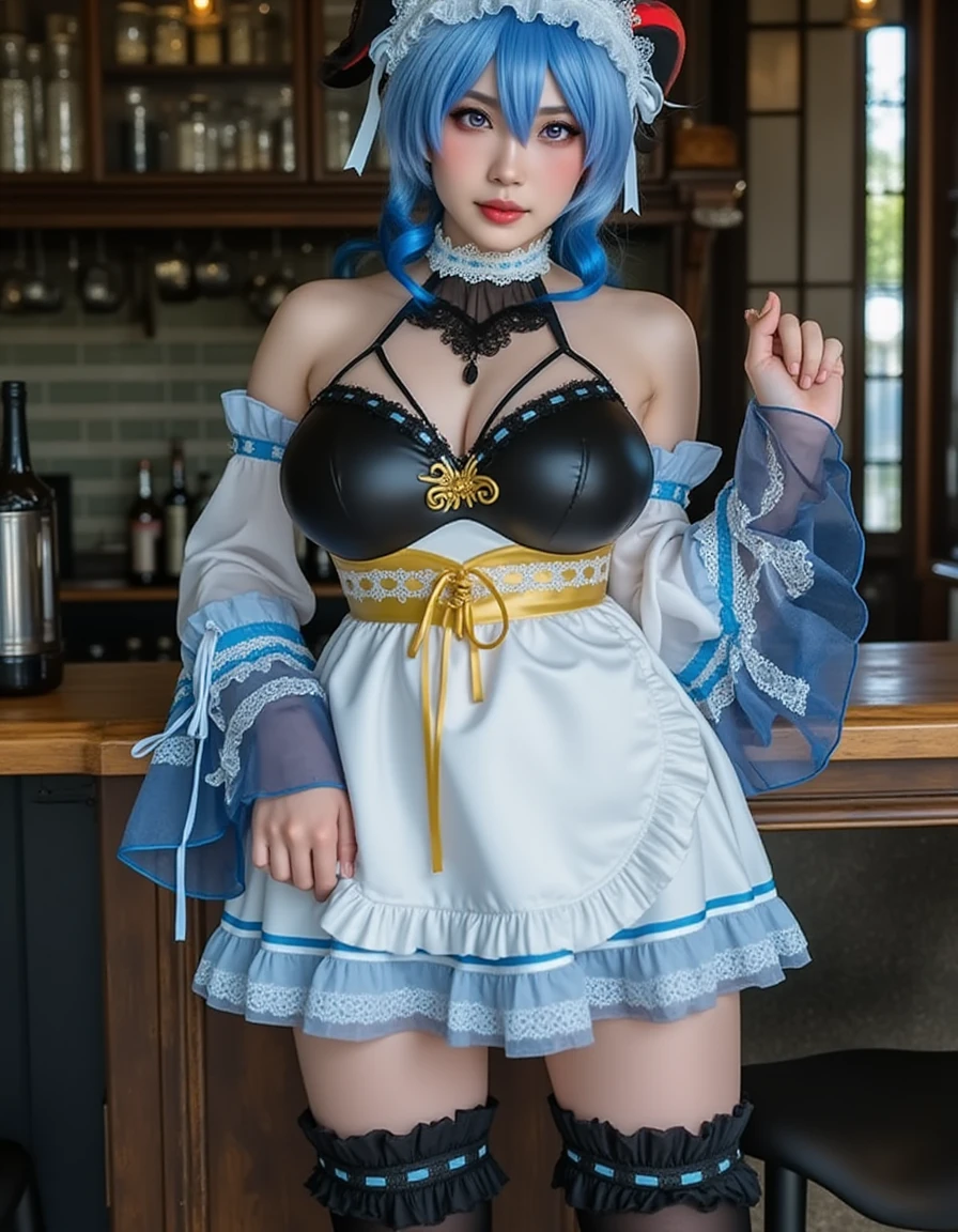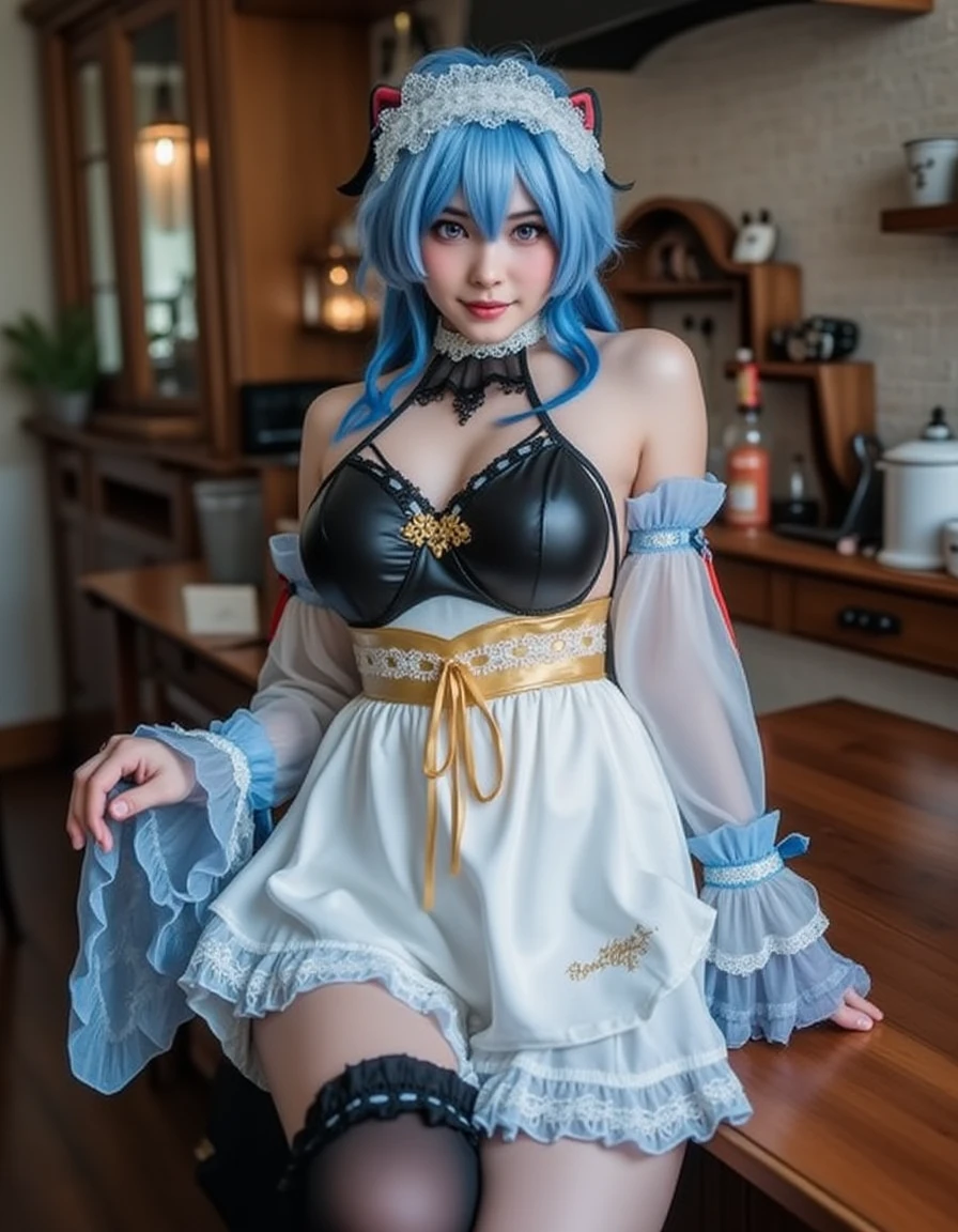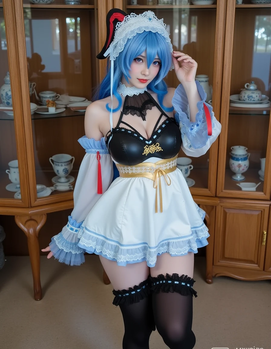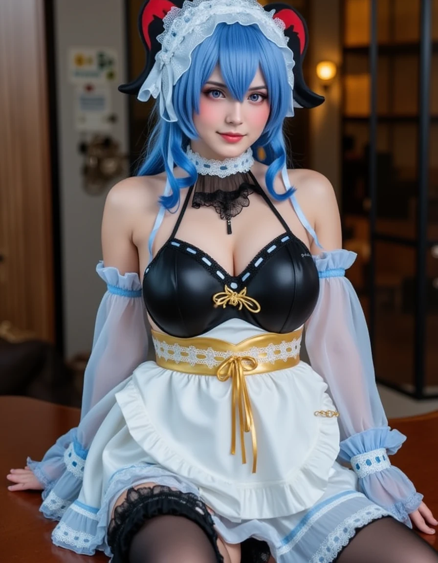 ganyu french maid , Blue and white cheongsam , qipaoganyu,hair between eyes , pantyhose,blue eyes,black dress,wide view, full body, sitting, cosplay, ganyu, thick body, ganyu, long black hair,