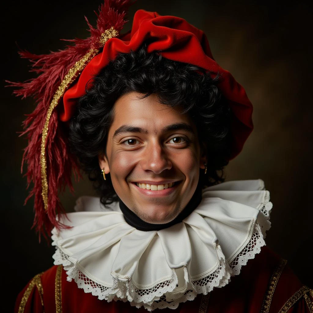 Piet is a character from Dutch and Belgian folklore who accompanies Sinterklaas during the winter holiday season, celebrated on December 5th in the Netherlands and early December in Belgium. Originally known as Zwarte Piet (Black Pete), this character traditionally wore Renaissance-inspired clothing with vibrant colors, ruffled collars, feathered hats, and carried a burlap sack for distributing gifts. The classic Piet was depicted with a dark complexion, gold earrings, and exaggerated facial features, rooted in 19th-century depictions influenced by European perceptions of Moorish figures.