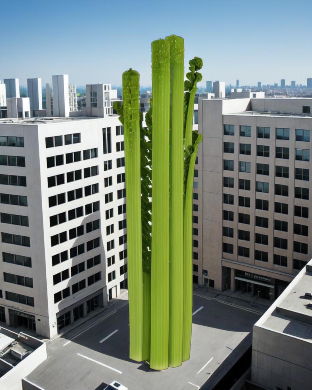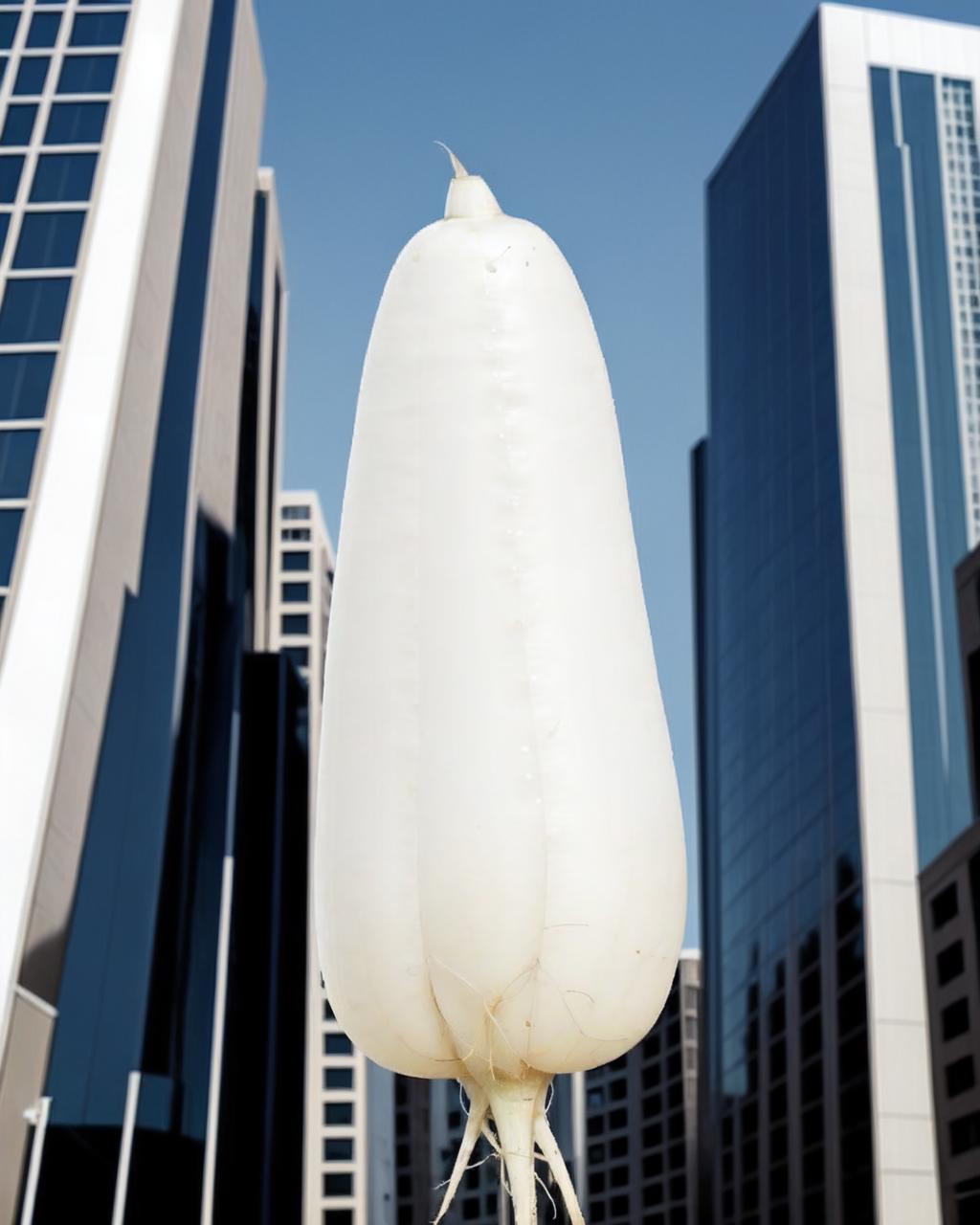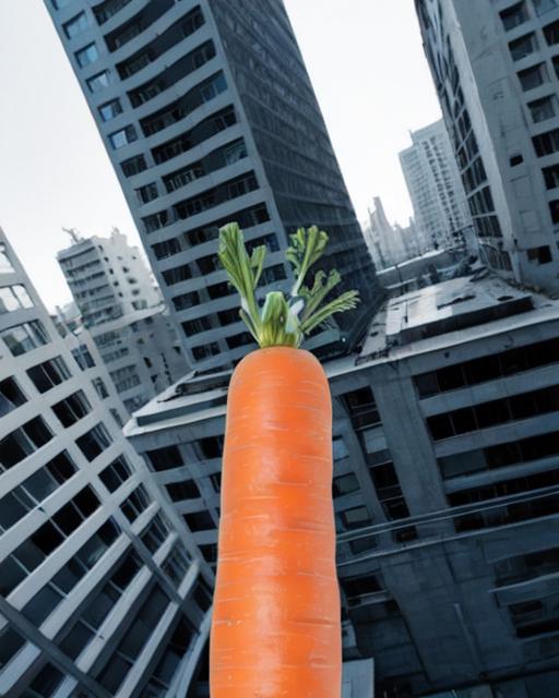 Cylindrical or conical vegetables are usually photographed lying down. However, with this LoRA, you can skewer the vegetables and photograph them vertically, like a skyscraper.