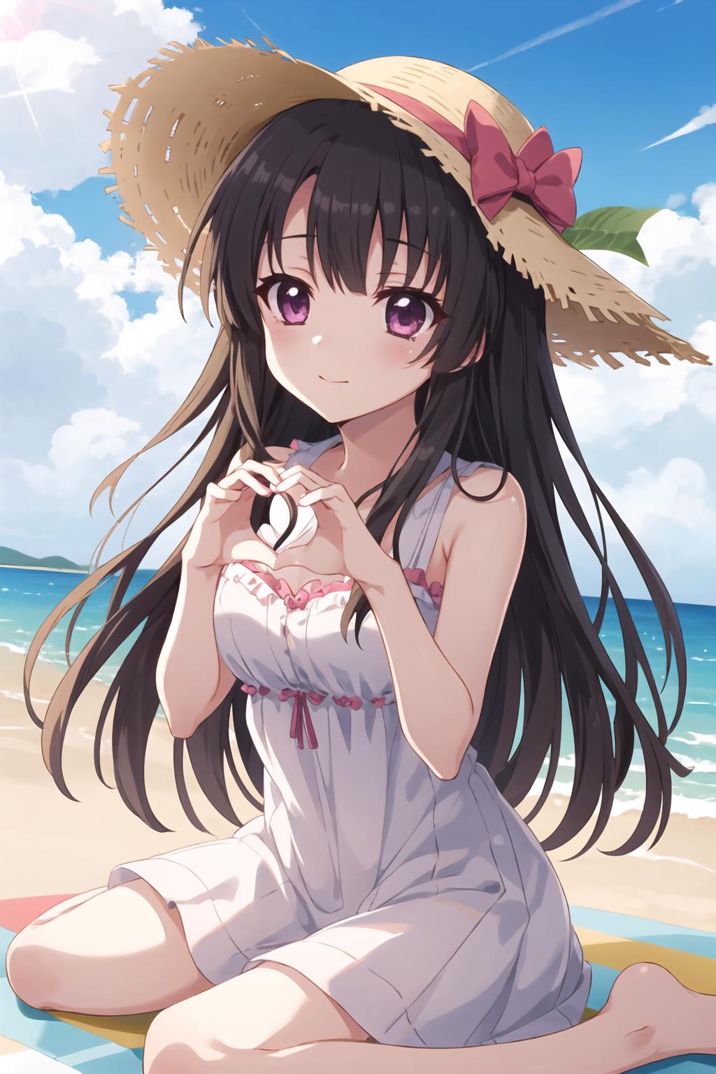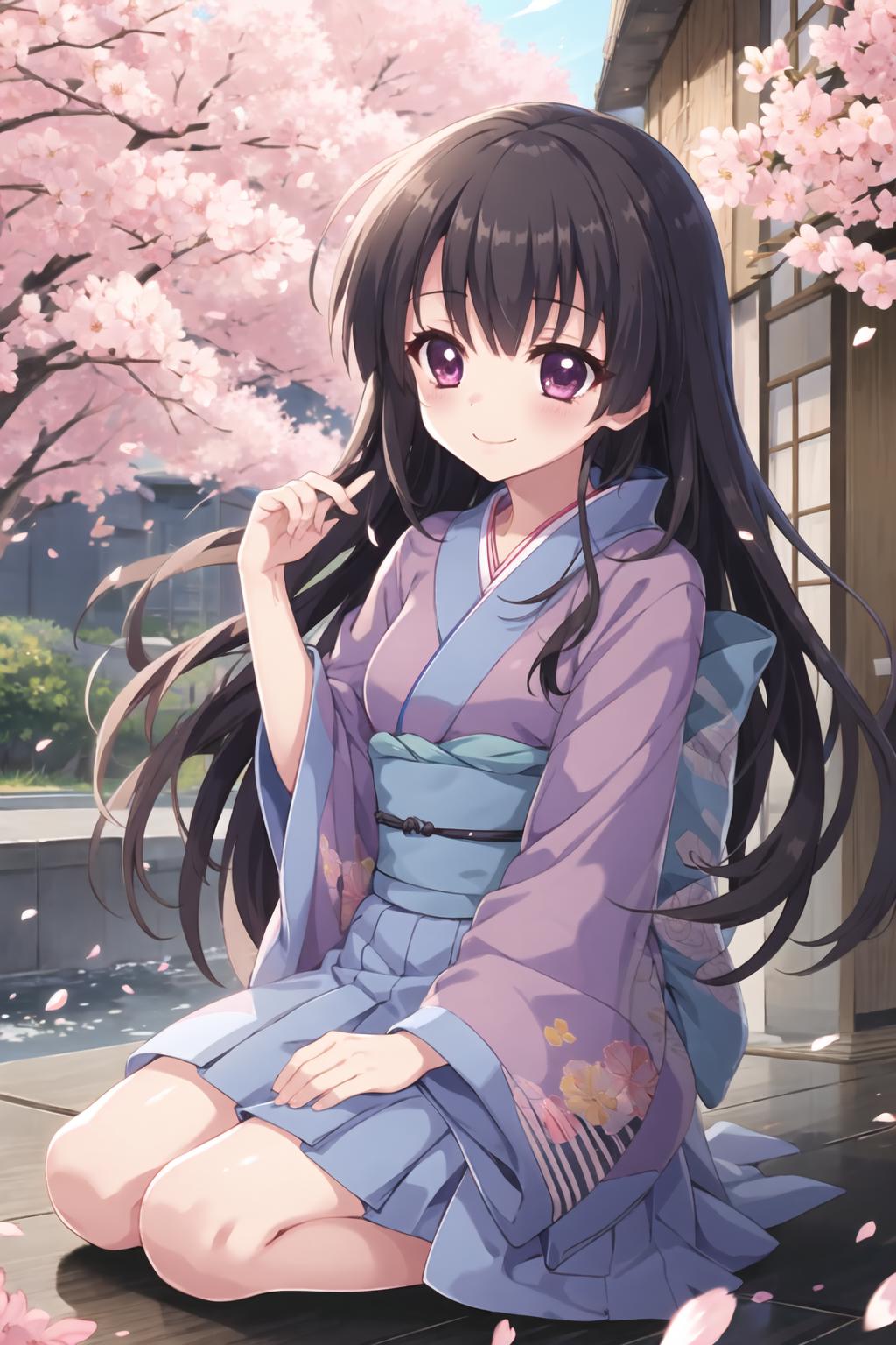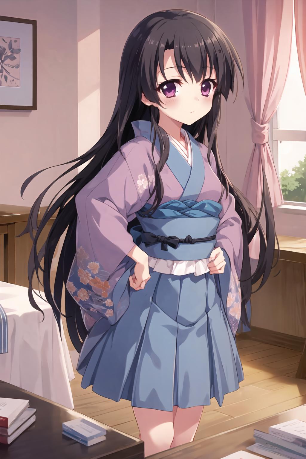 ichikishima mizuha \(re:stage!\), black hair, very long hair, darkmagenta eyes,