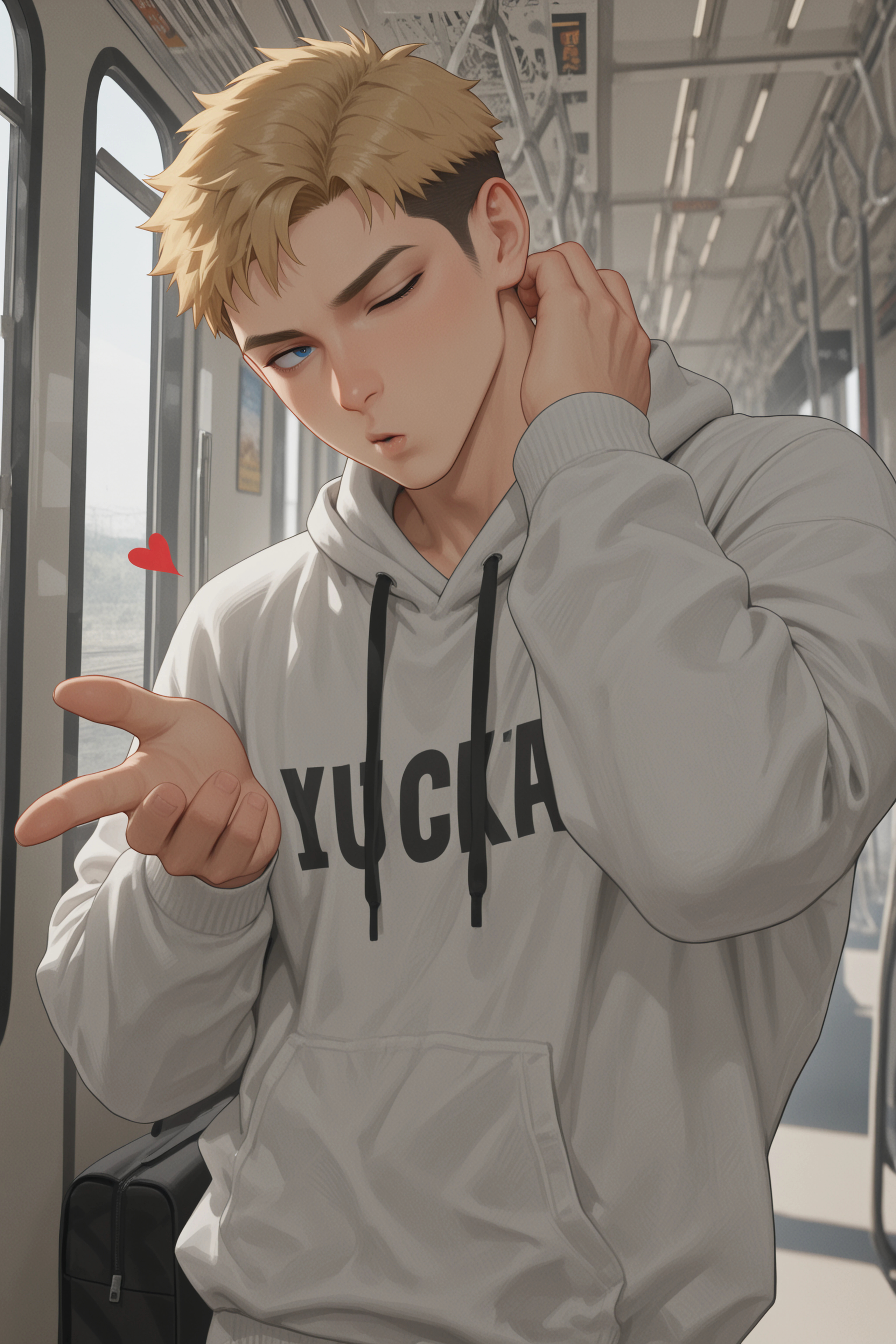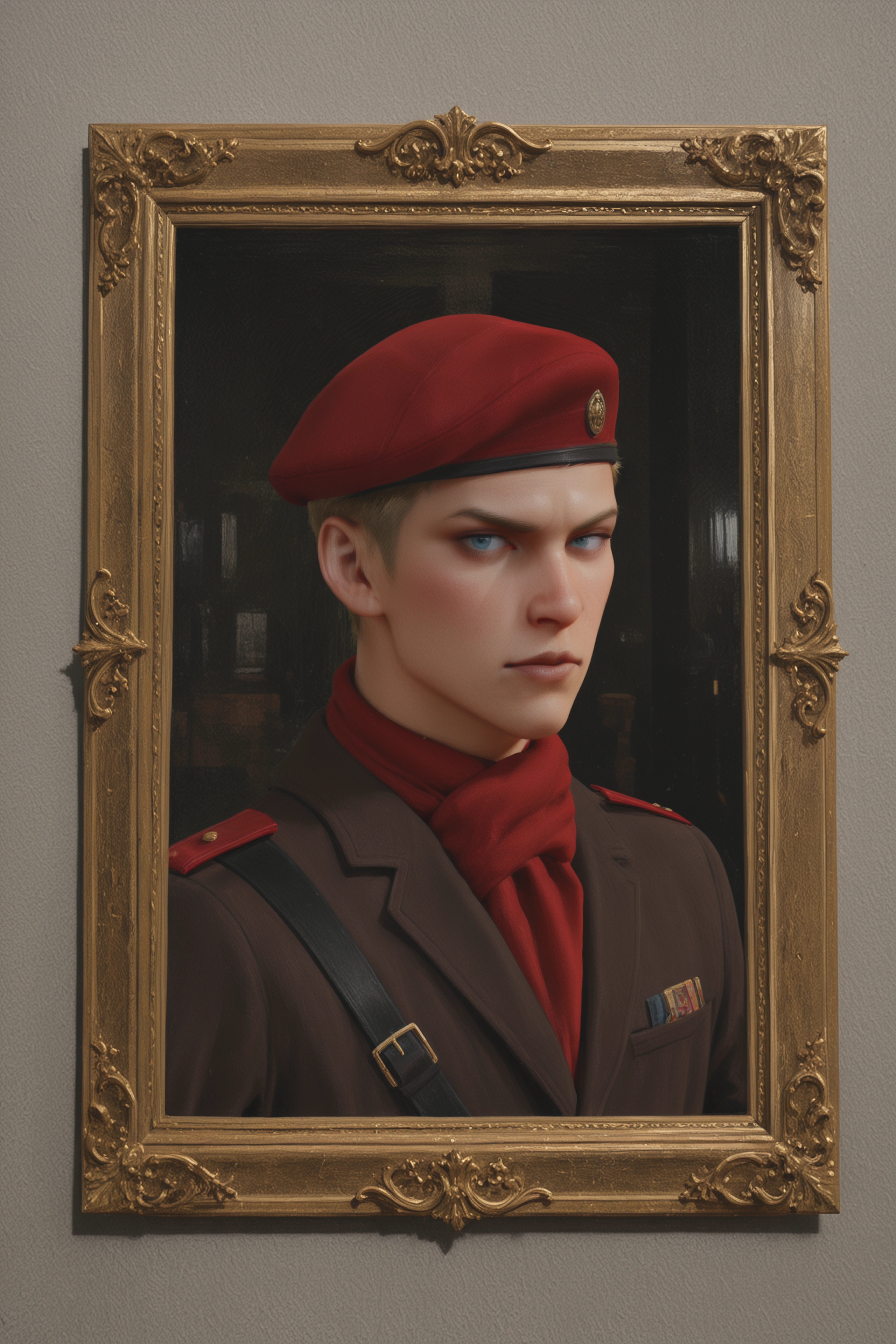 Suggested Character Tags: 1boy, male focus, solo, blonde hair, short hair, blue eyes, brown jacket, red gloves, red scarf, red beret, bandolier