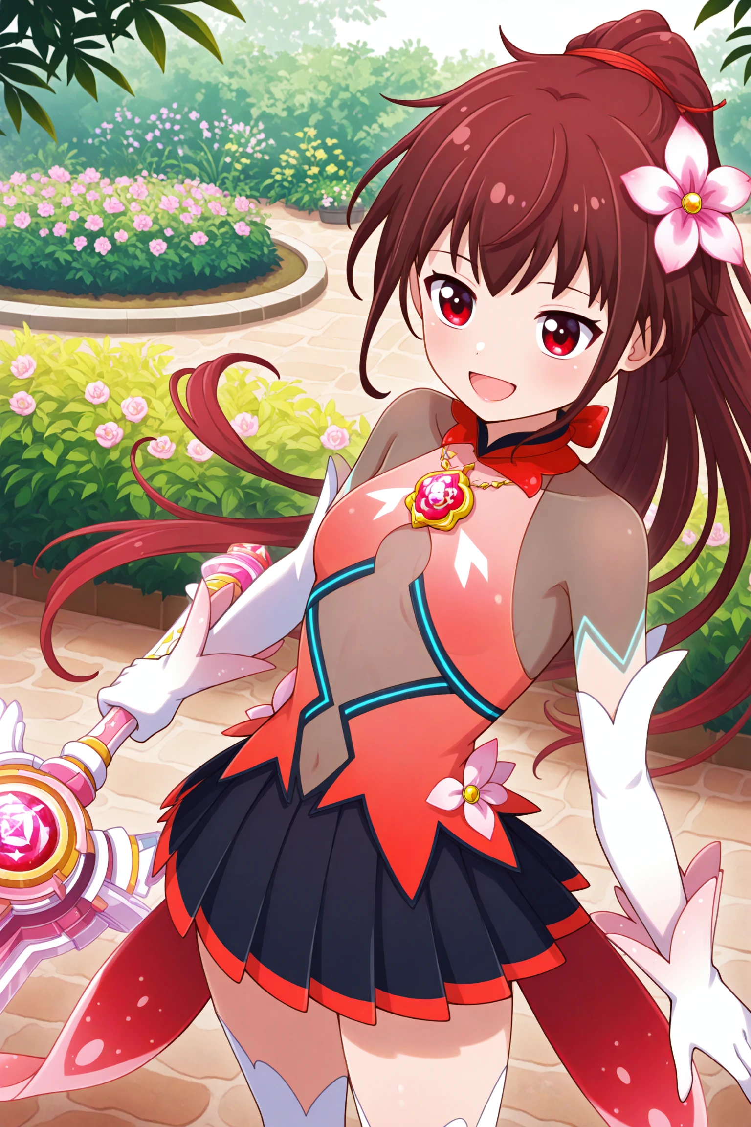 outfit3, magical girl, gem brooch, hair flower, gem necklace, pink flower, red bodysuit, see-through sleeves, white gloves, elbow gloves, black skirt, pleated skirt, white thighhighs