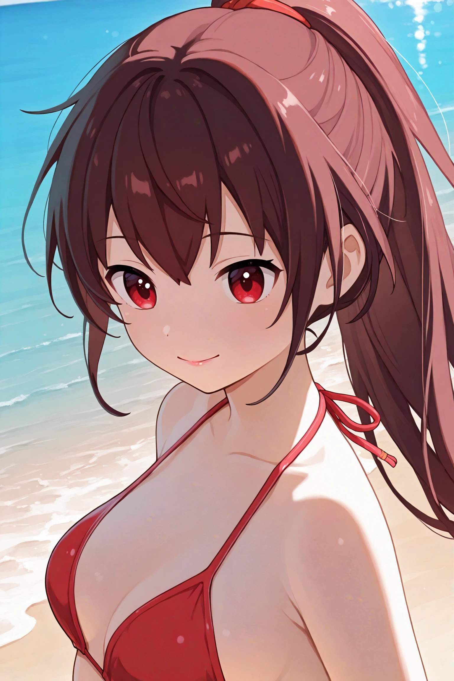 reddish brown hair, red hair ribbon, high ponytail, hair between eyes, very long hair, sidelocks, red eyes