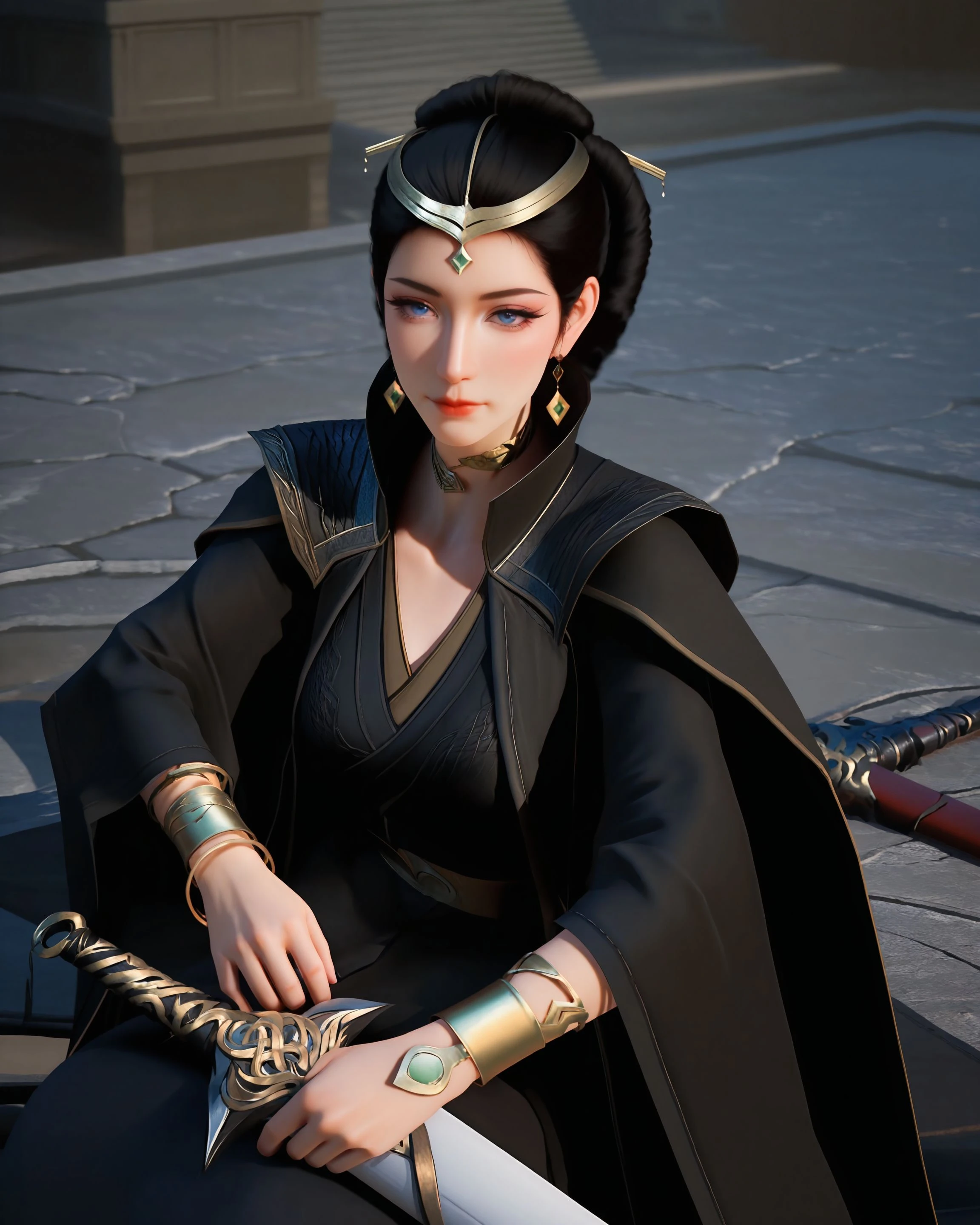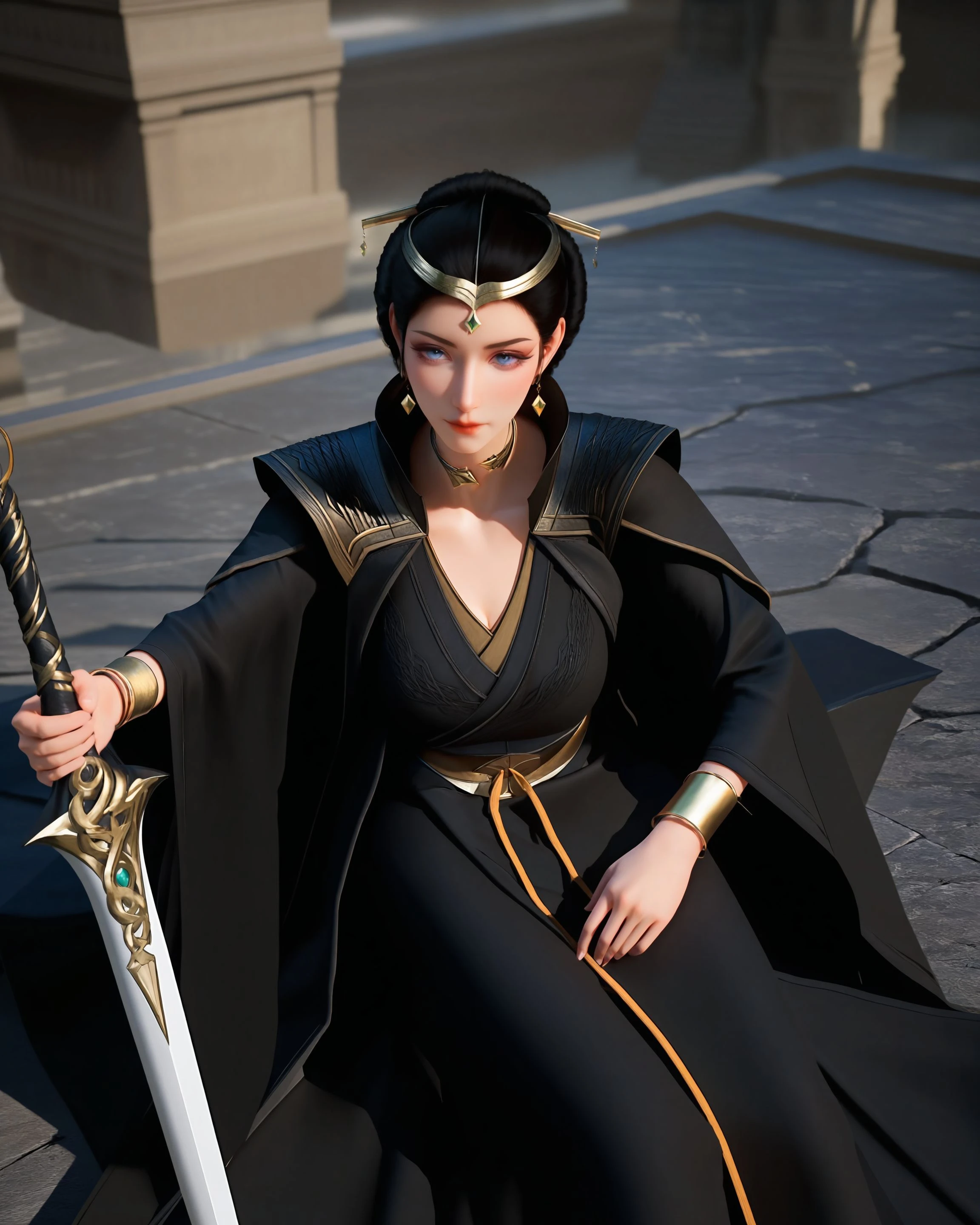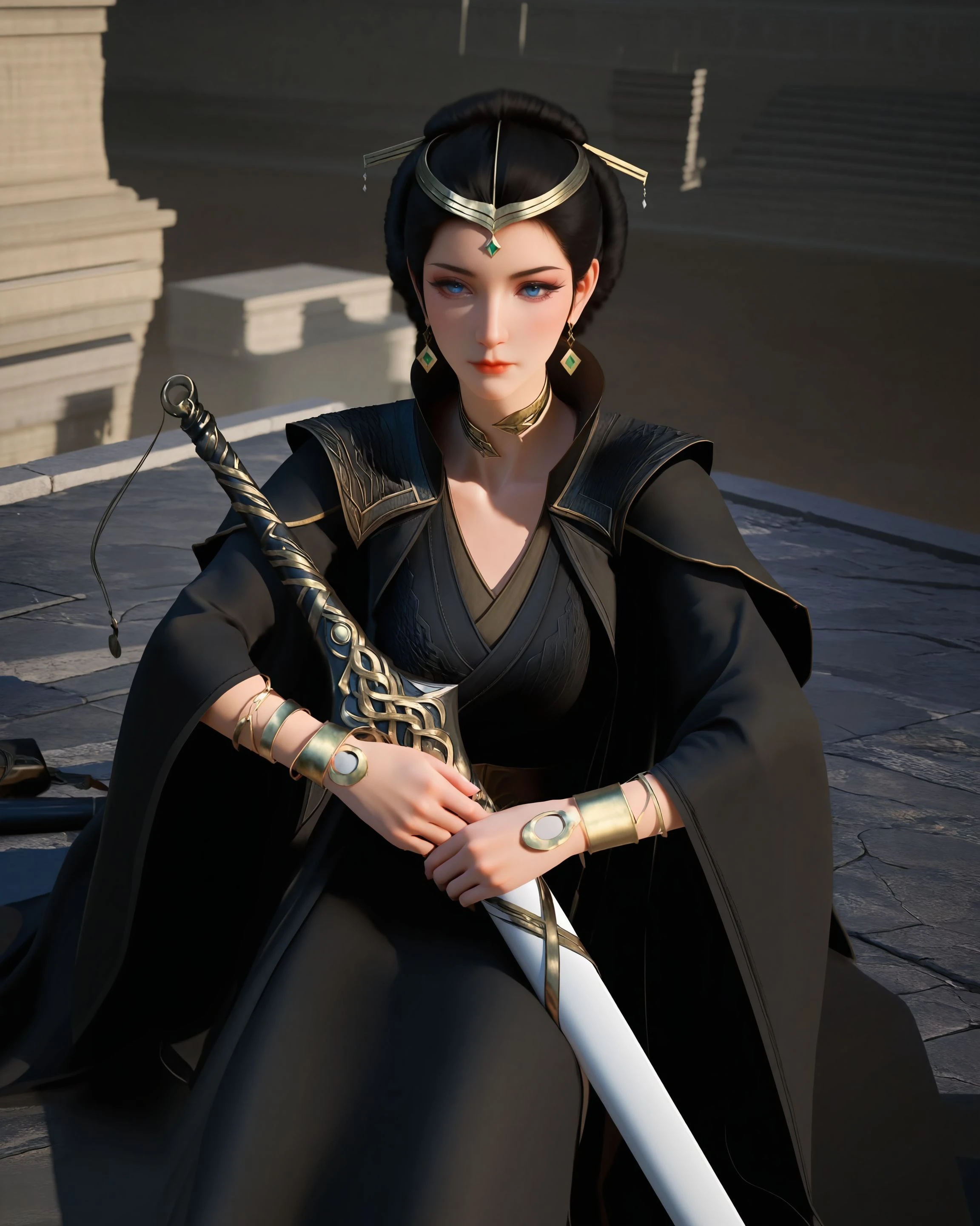 1girl,jewelry,solo,bracelet,earrings,black hair,circlet,blue eyes,wide sleeves,black dress,black robe,