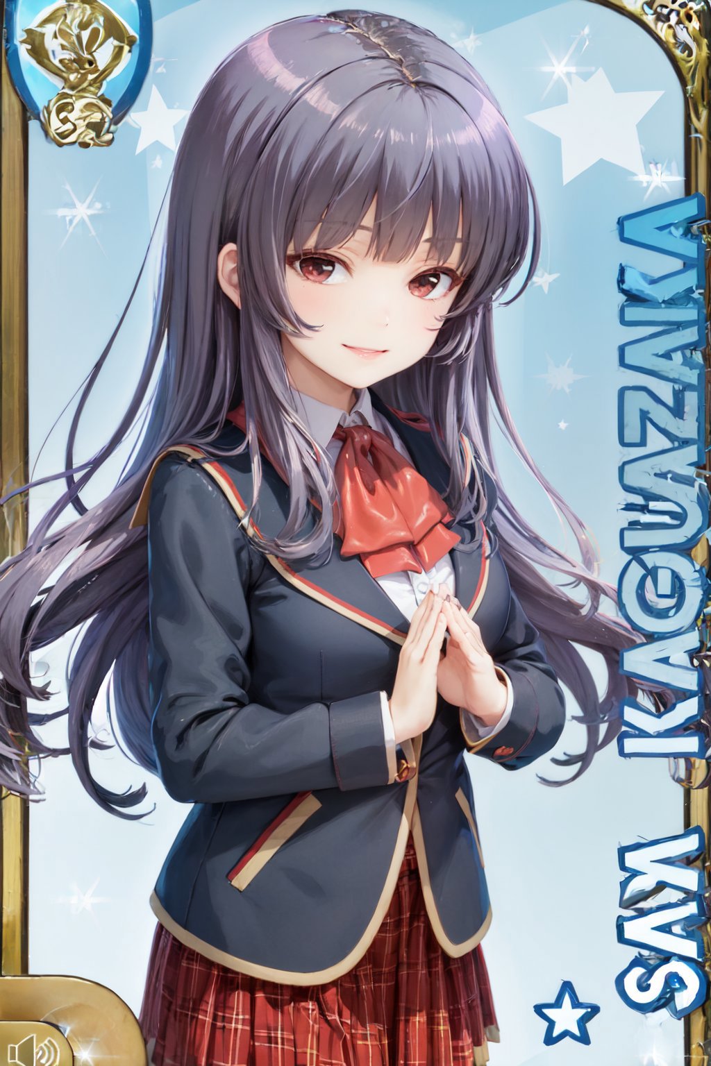 Add purple hair and red eyes if necessary. The dataset is filled to the brim with the tag card \(medium\).