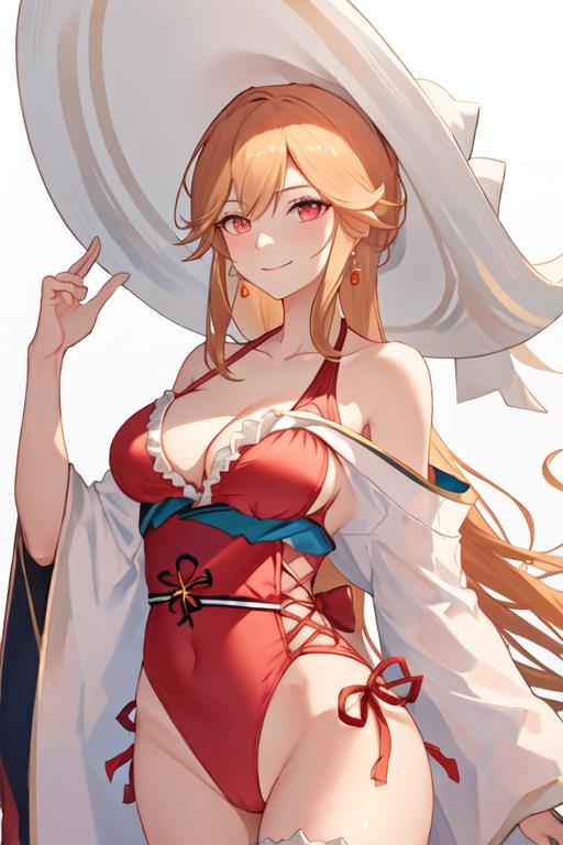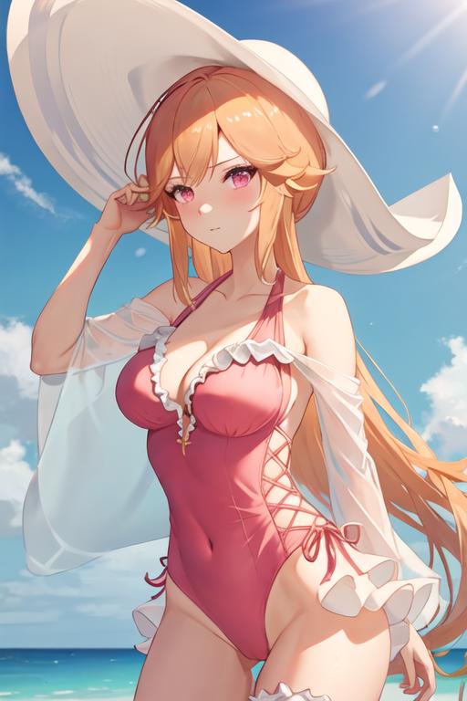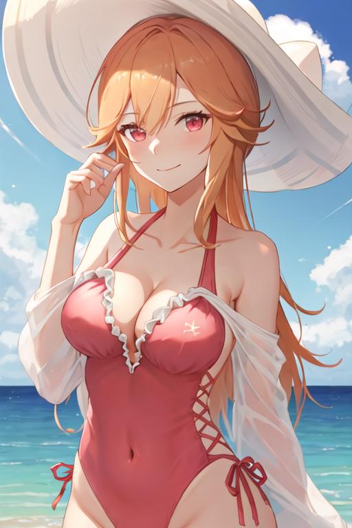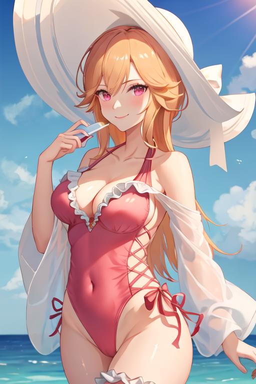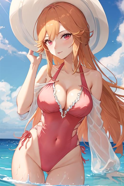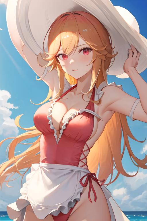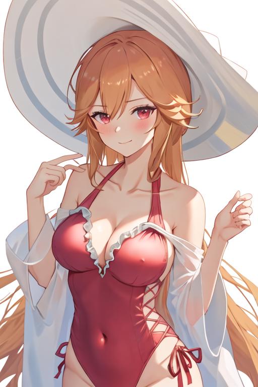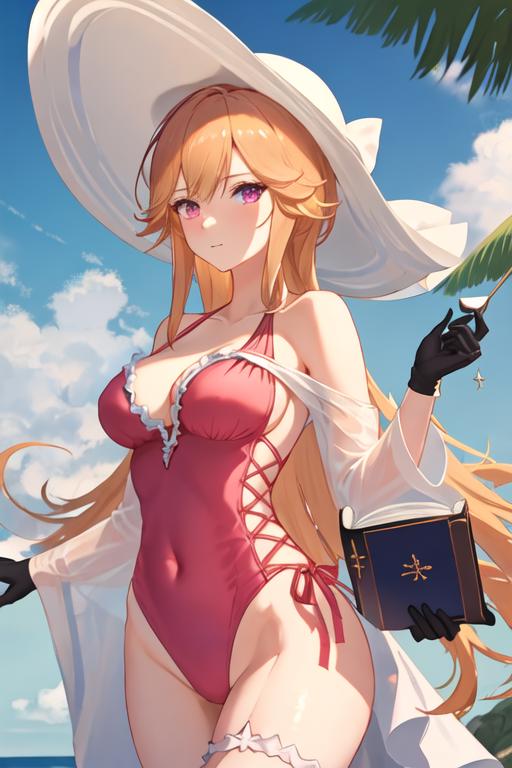 The trigger word is richelieu_azurlane, and the recommended tags are best quality, masterpiece, highres, solo, {richelieu_azurlane:1.15}, long_hair, breasts, blonde_hair, large_breasts, swimsuit, hat, red_eyes, white_headwear, cleavage, orange_hair, one-piece_swimsuit, pink_one-piece_swimsuit, sun_hat.