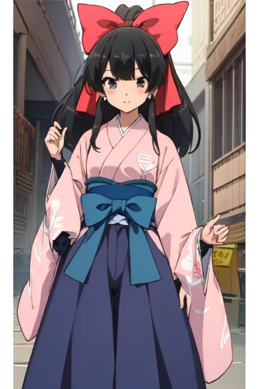 YaeKokonoe, 1girl, solo, long hair, black hair, hair bow, red bow, ponytail, wide sleeves, pink kimono, black eyes, sash, hair tubes, blue hakama, hakama skirt,