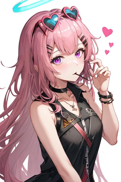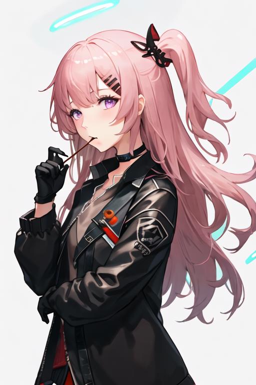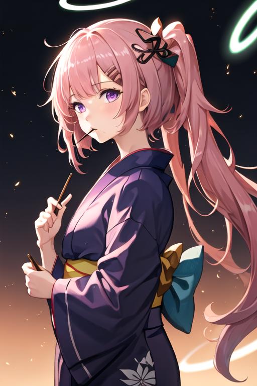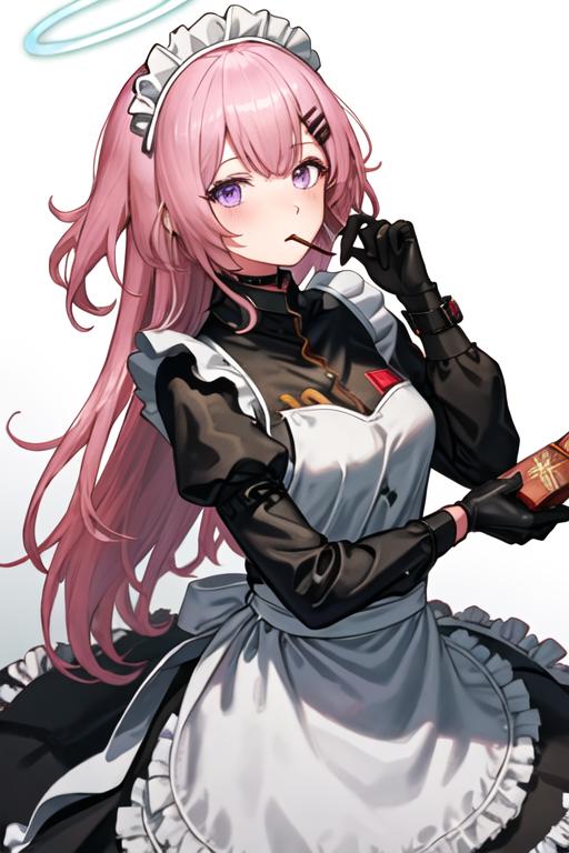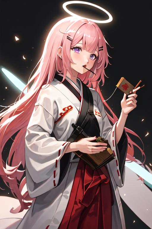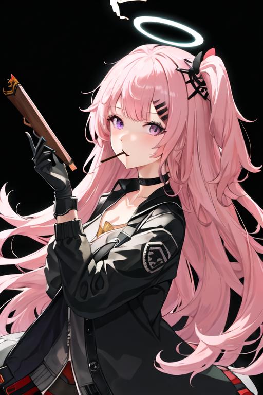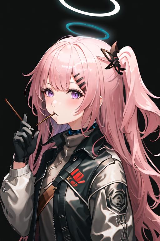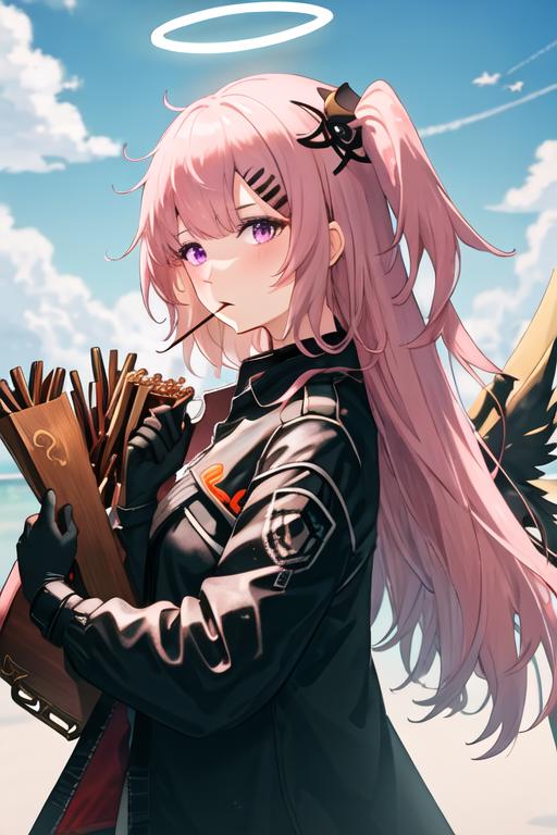 The trigger word is ambriel_arknights, and the recommended tags are best quality, masterpiece, highres, solo, {ambriel_arknights:1.15}, long_hair, pink_hair, bangs, one_side_up, halo, hair_ornament, hairclip, food, purple_eyes, upper_body, pocky, mouth_hold.