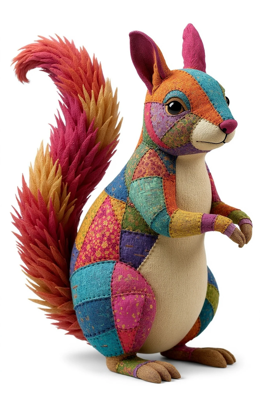 6. Colorful patchwork patterns, craft a small squirrel, patchworks showing its lively climbing posture.