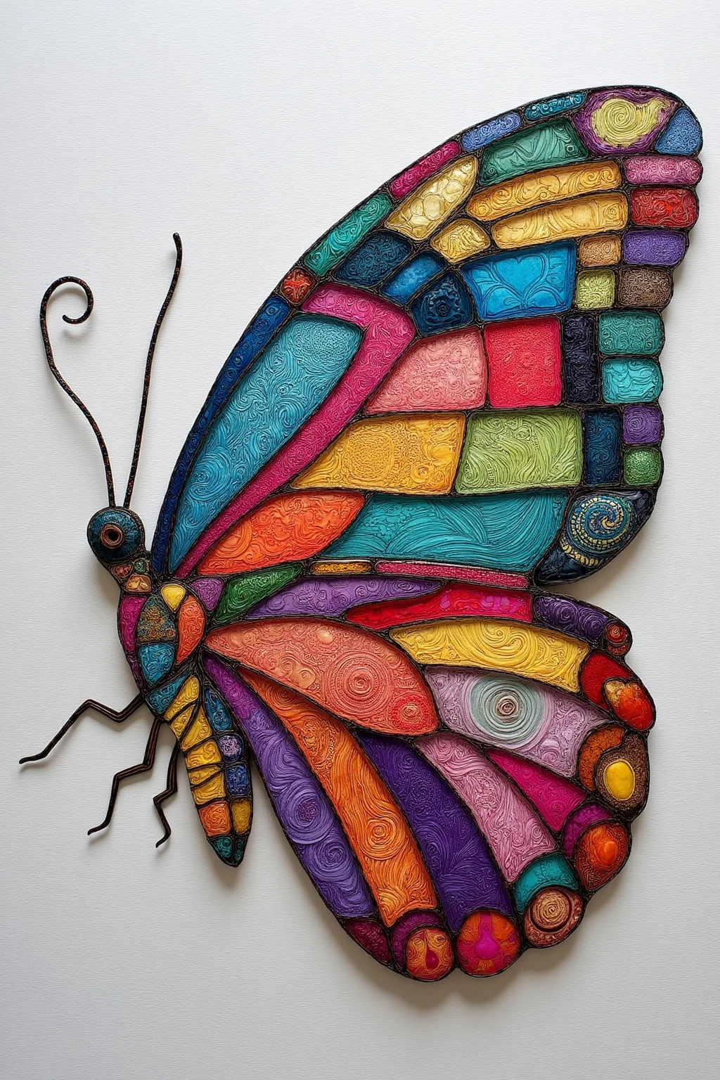 9. Colorful patchwork patterns, design a delicate butterfly, wings as colorful patchwork art.