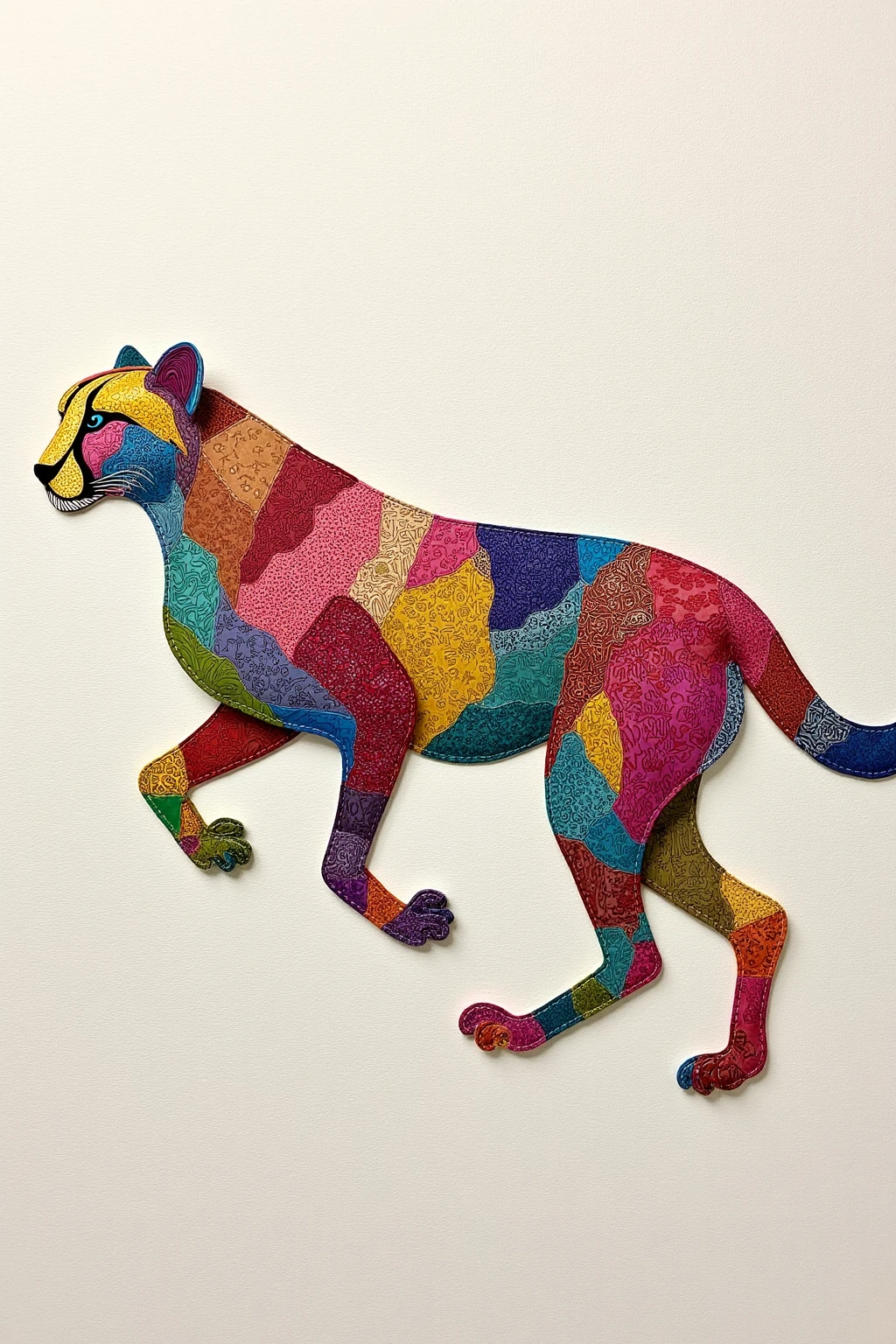 3. Colorful patchwork patterns, depict a swift cheetah, with patchworks forming its dynamic running shape.