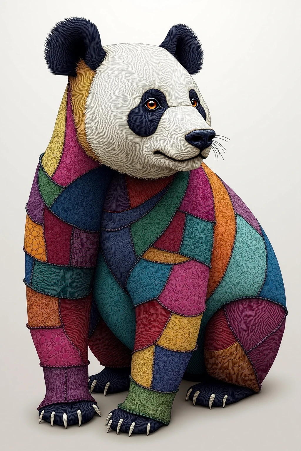4. Colorful patchwork patterns, make a gentle panda, black - white areas replaced by colorful patchworks.