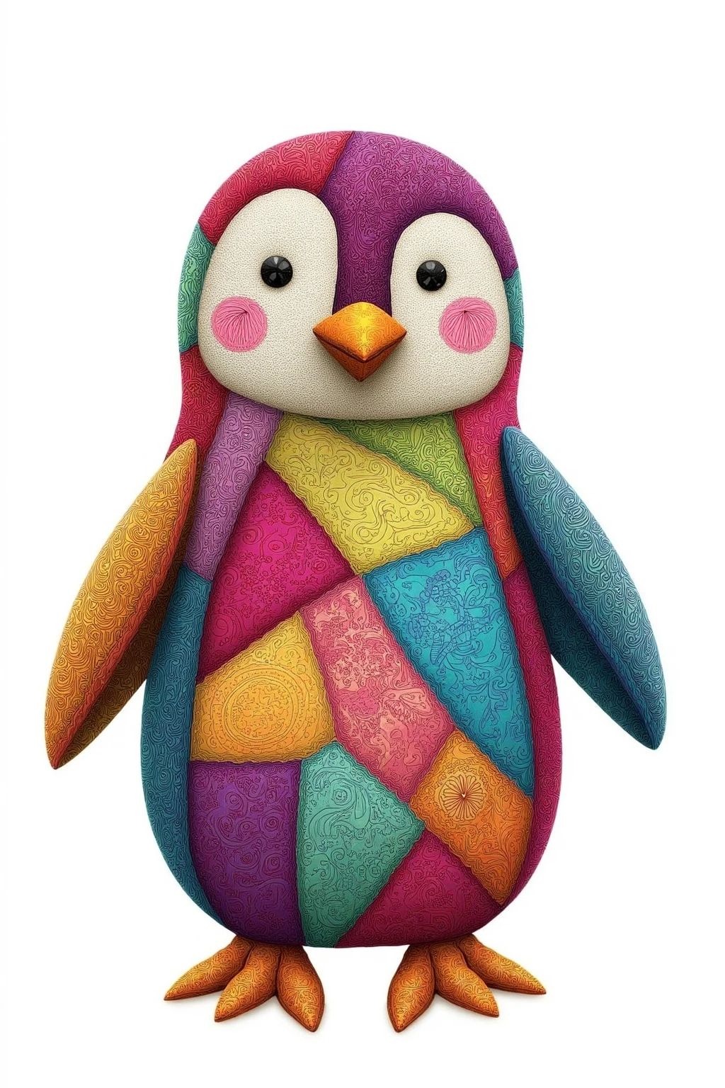 2. Colorful patchwork patterns, design a cute penguin, each part of its body is a unique colorful patchwork.