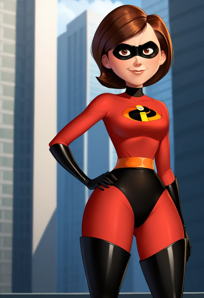 helen parr, 1girl, solo, brown hair, brown eyes, red bodysuit, domino mask, elbow gloves, lips, yellow belt, thigh boots