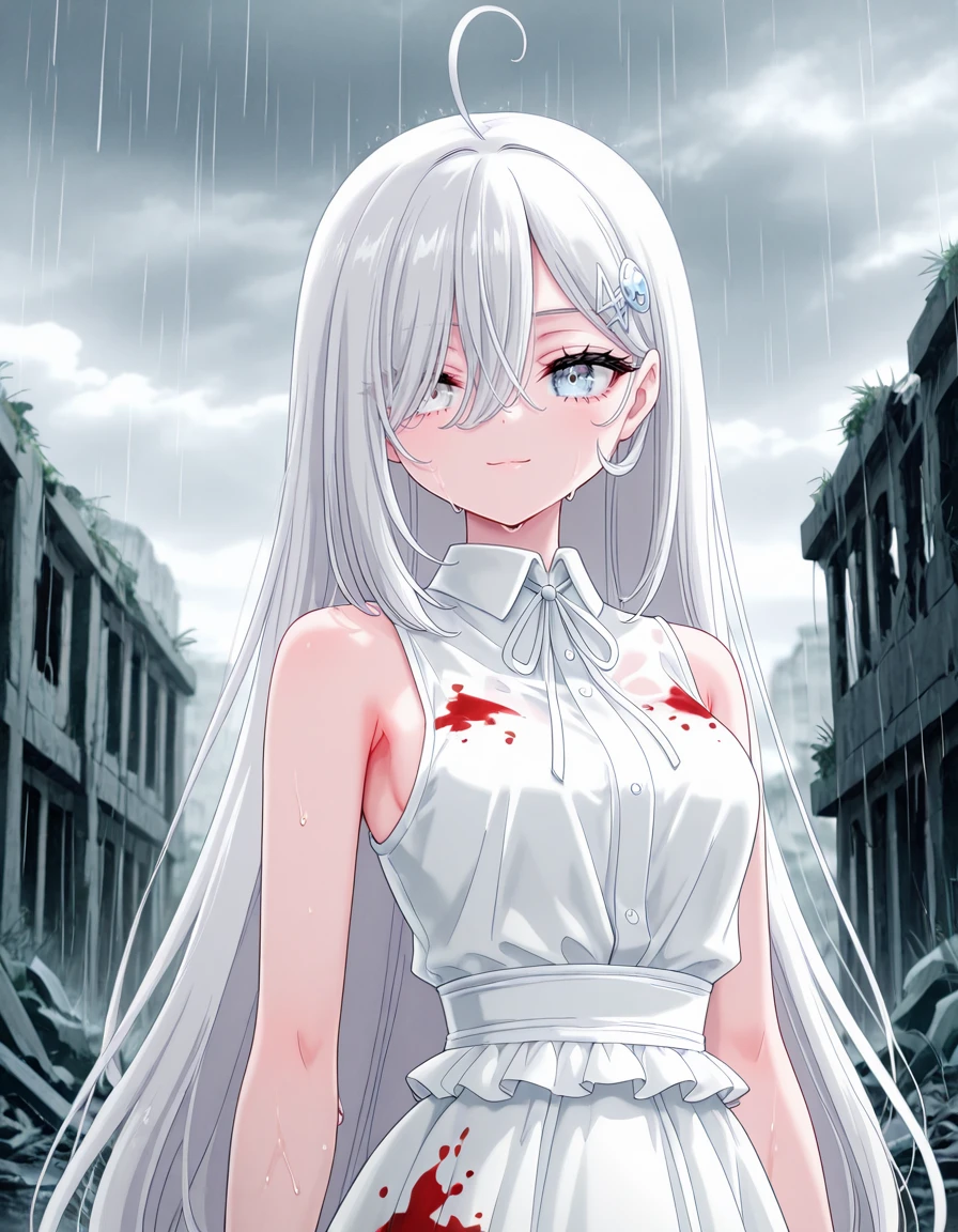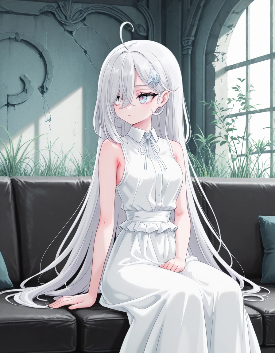 <lora:sorimachi_yuuki_scrap_building-shiboyugi_s1-ixl-anime-soralz:1>, sorimachi yuuki (shiboyugi), long hair, white hair, ahoge, hair between eyes, straight hair, hair over one eye, (grey eyes:1.4), (blue eyes:1.2), heterochromiaOutfit - White Dress