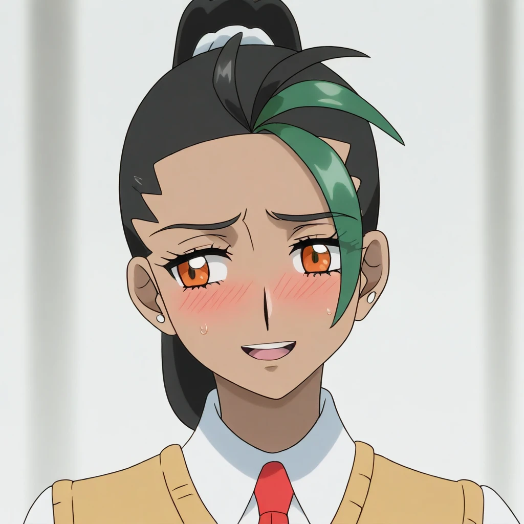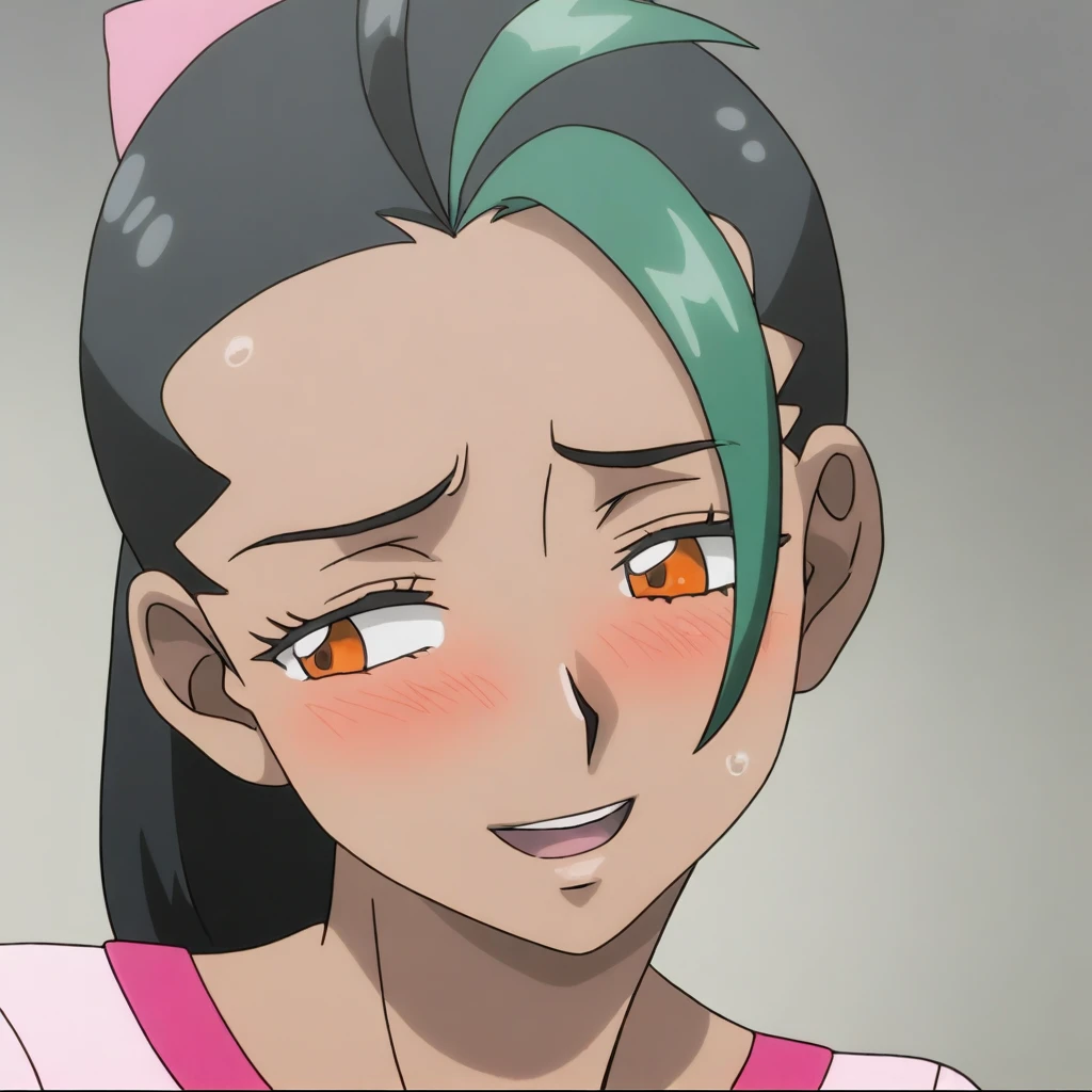 Always use: 1woman, (mature female), blush, blushing, big breasts, perfect face, perfect body, brown hair, ponytail, white bow, brown eyes