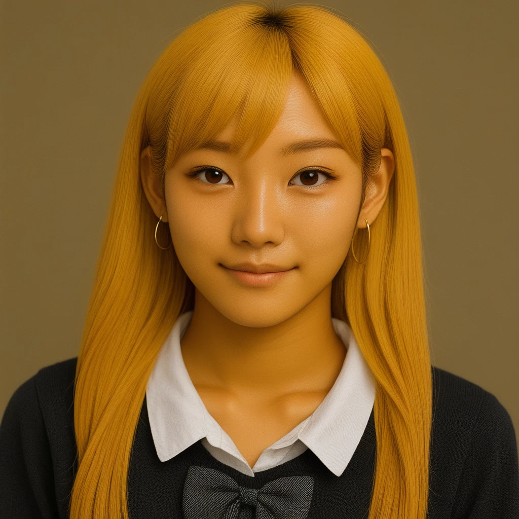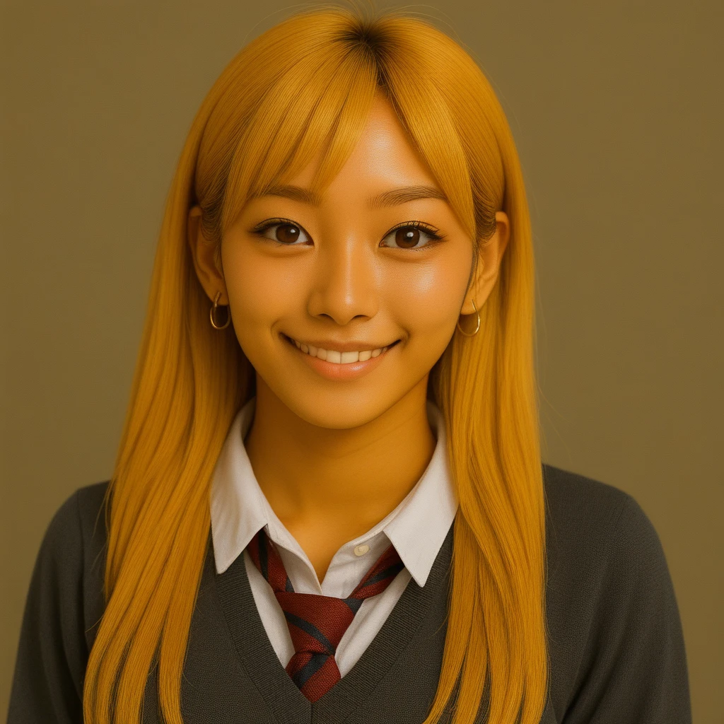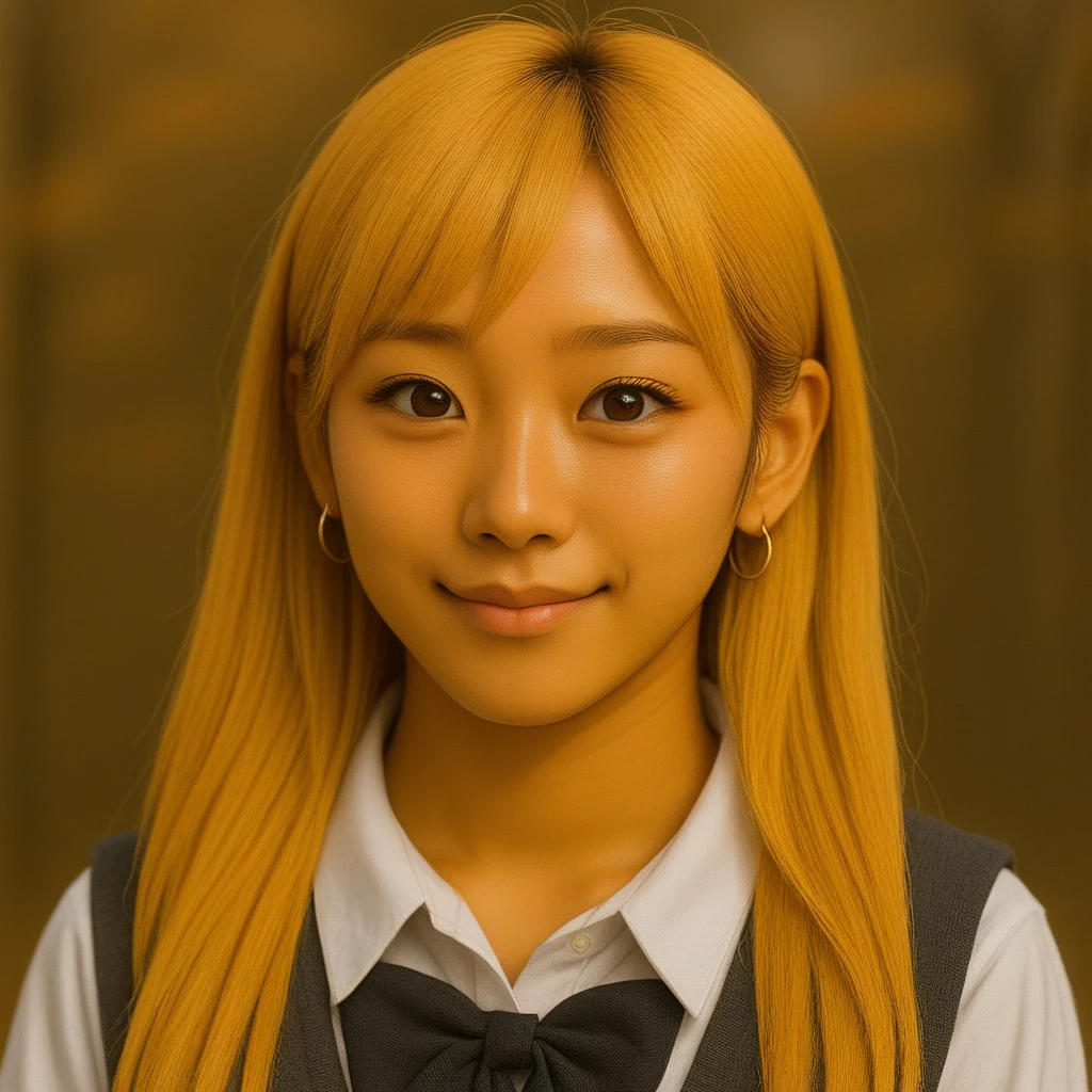 shiho-girl, yellow hair, long straight hair, inner colored hair tips, natural tanned skin, hazel brown eyes, soft closed lips, pierced ears, school uniform or casual clothes, gyaru, beautiful asian teenage face, flawless skin, natural makeup, soft smile, cute expression