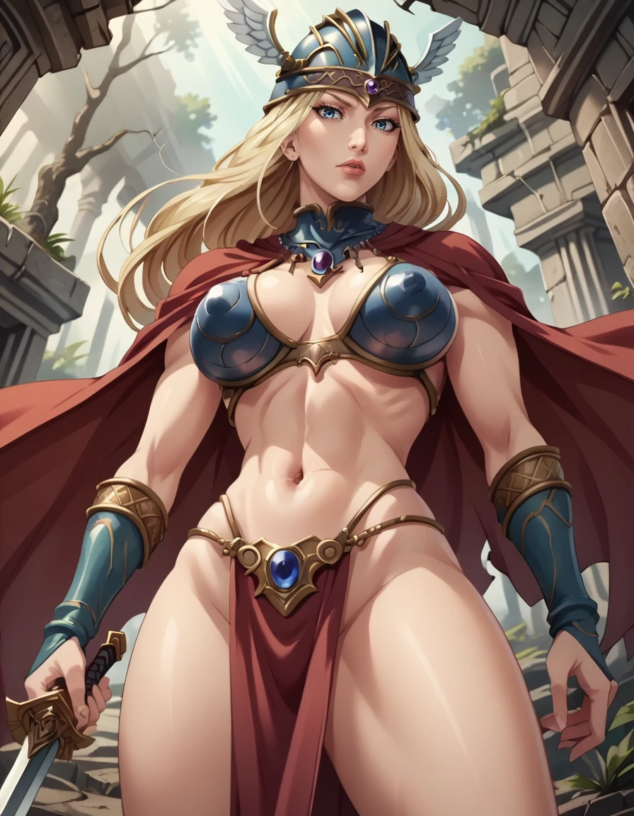cape, bridal gauntlets, winged helmet, sandals, bikini armor, pelvic curtain,