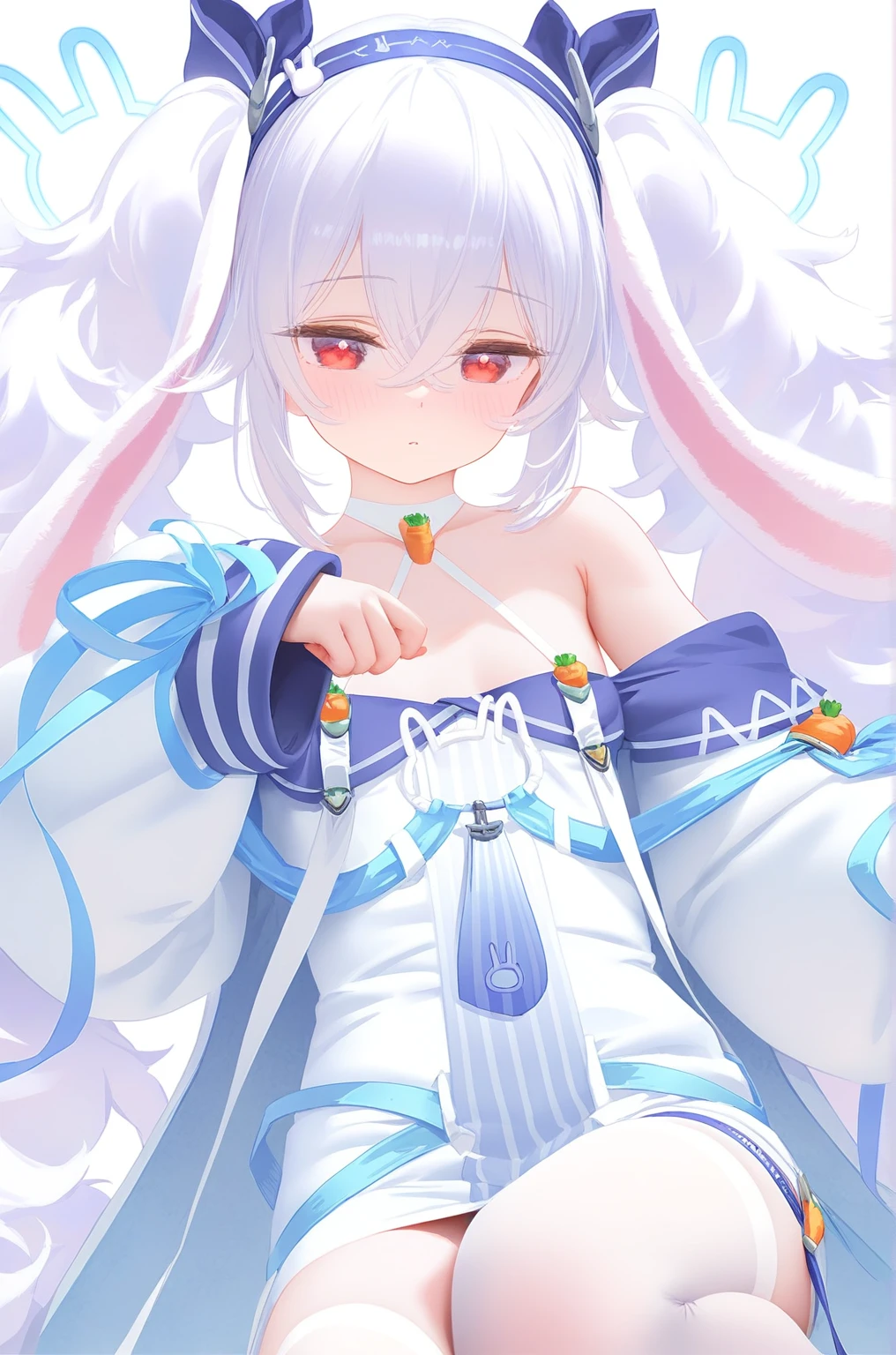 laffey ii \(azur lane\),long_hair,white hair,red eyes,twintails,rabbit ears,white dress,blue hairband,rabbit o-ring, blue ribbon,long sleeves, puffy long sleeves,animal slippers