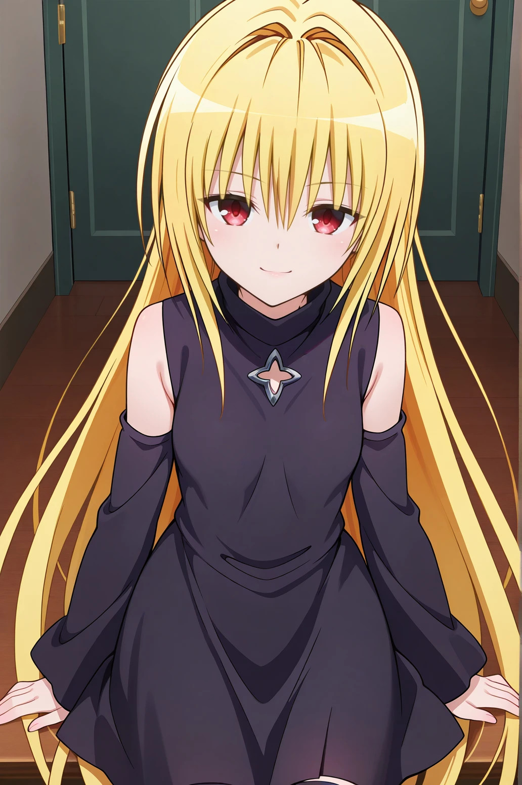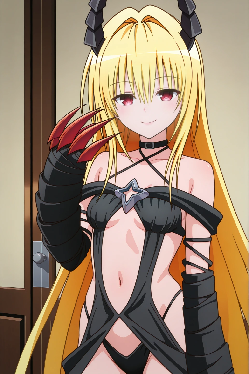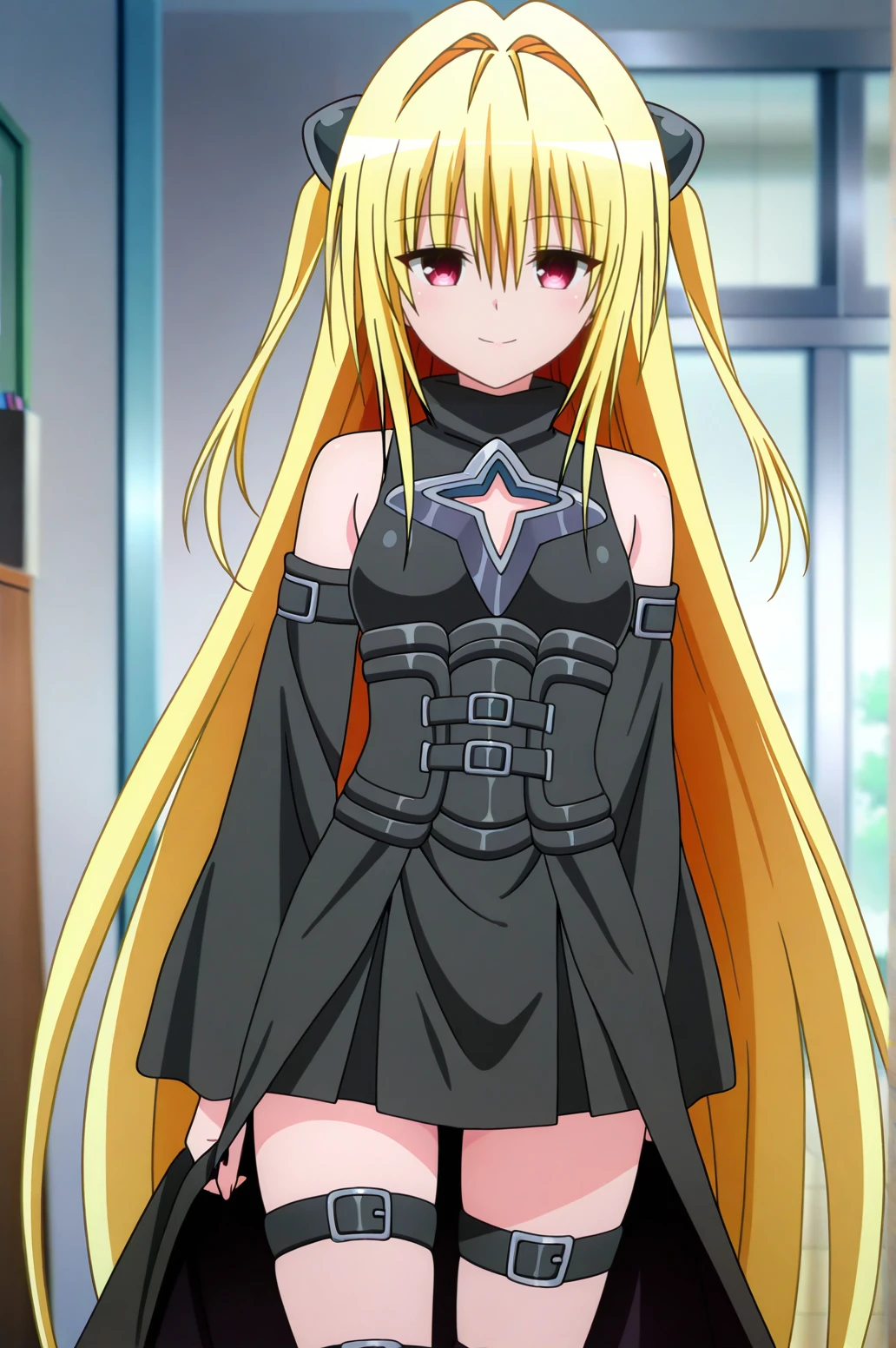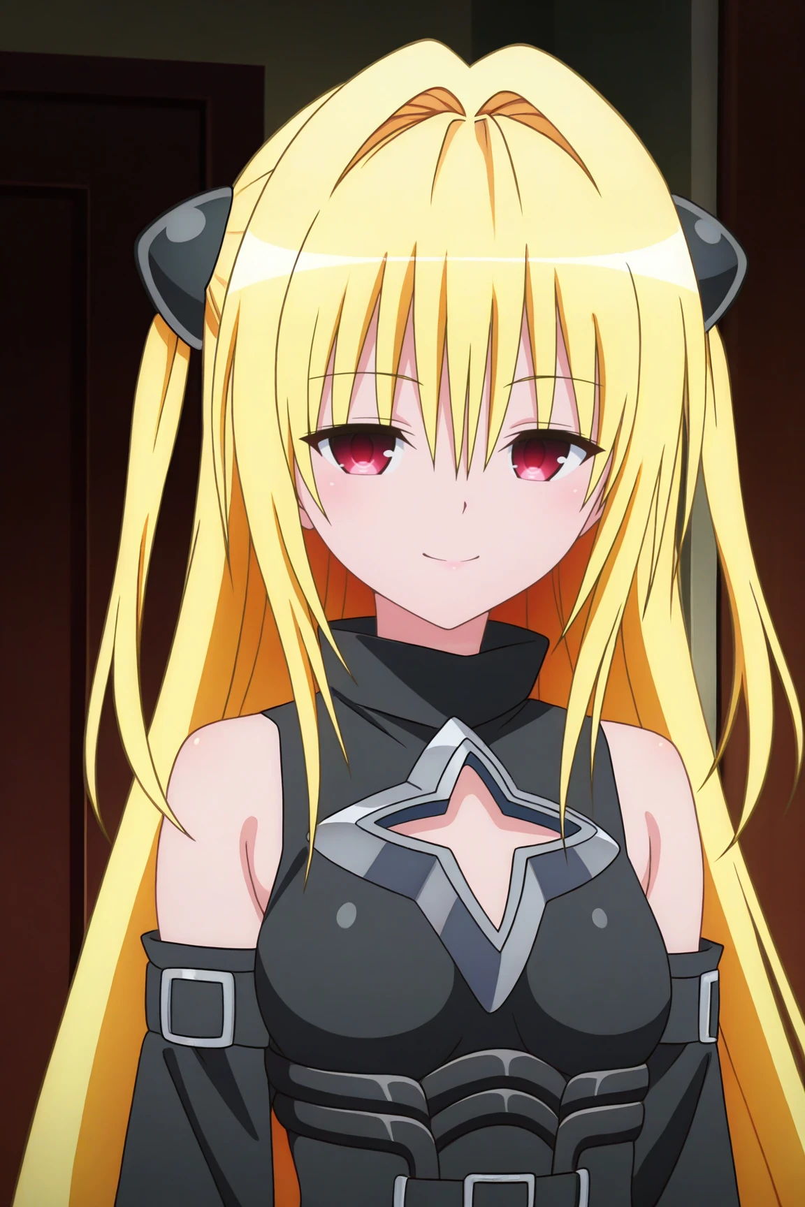 1girl, konjiki no yami, to love-ru darkness, red eyes, blonde hair, hair ornament, two side up,outfit 1 (Black Battle Dress):