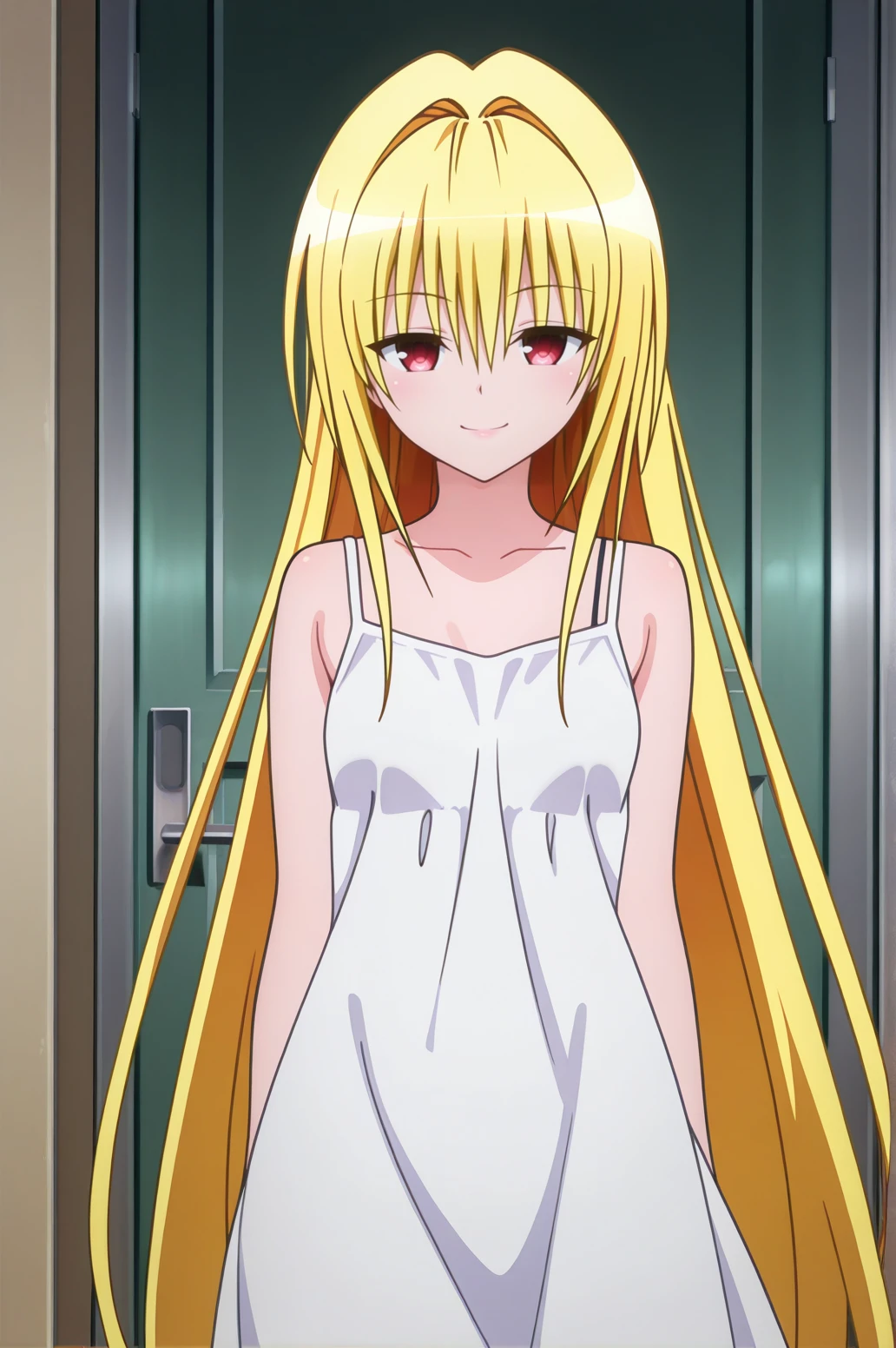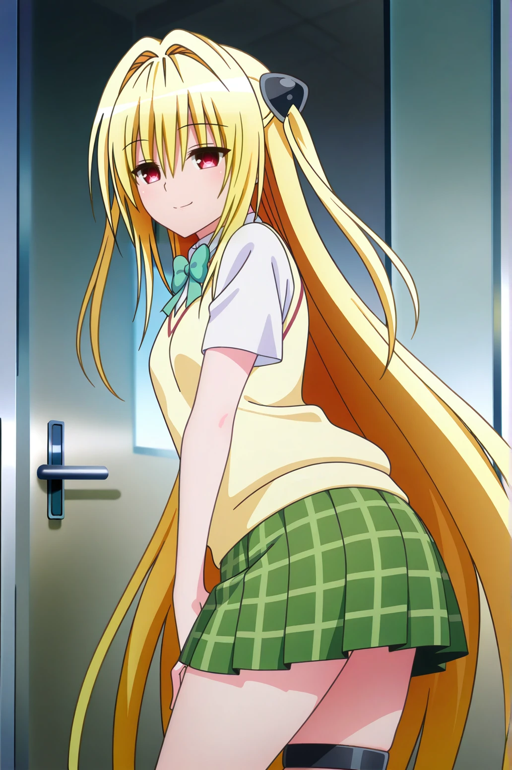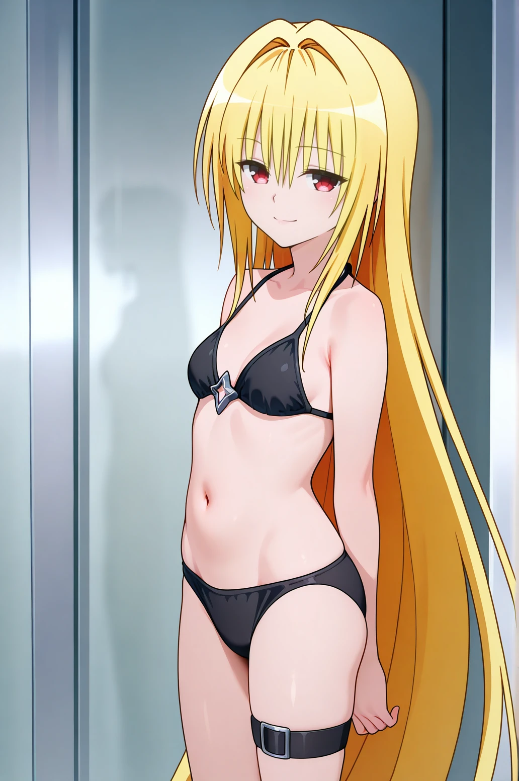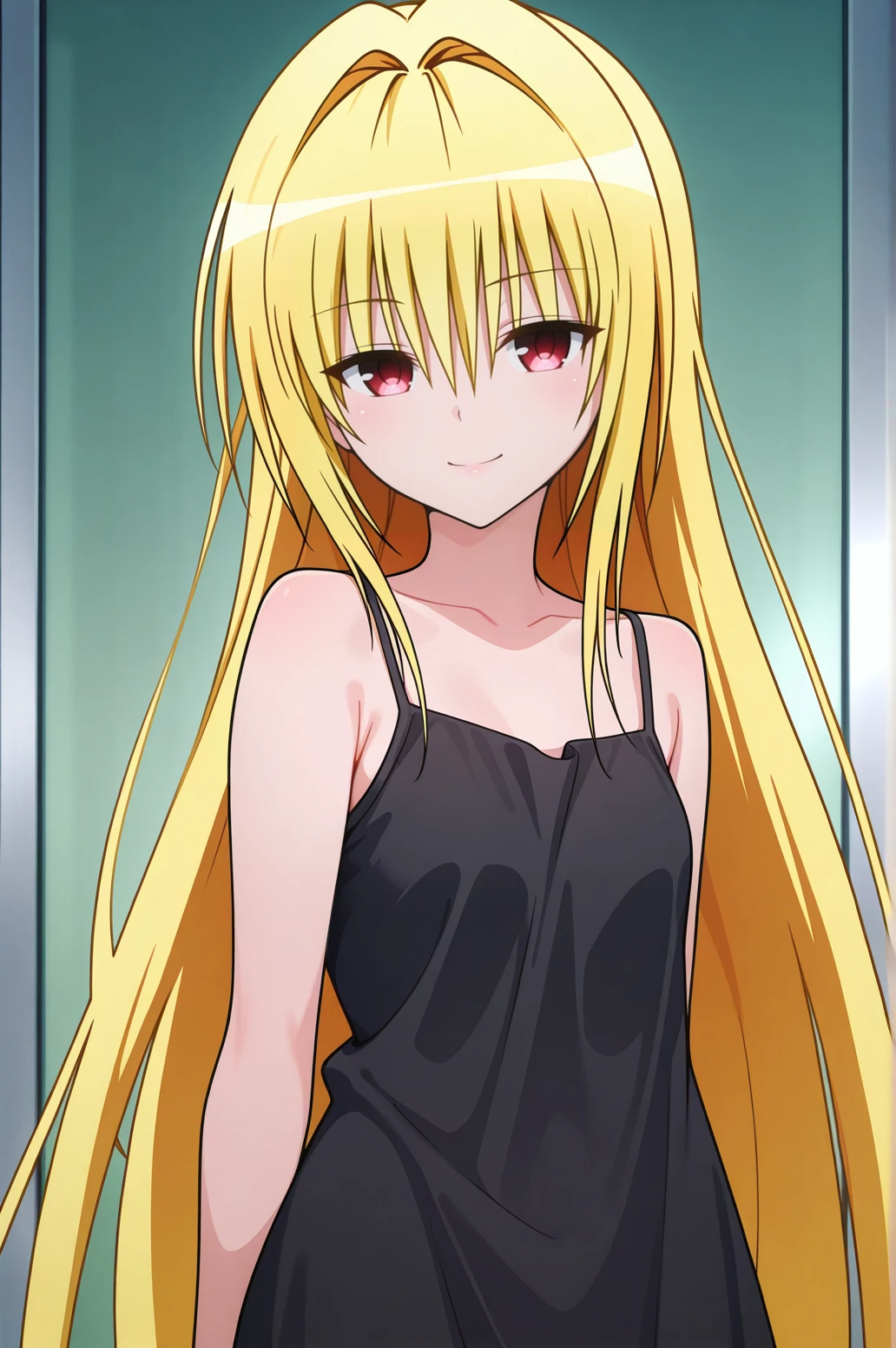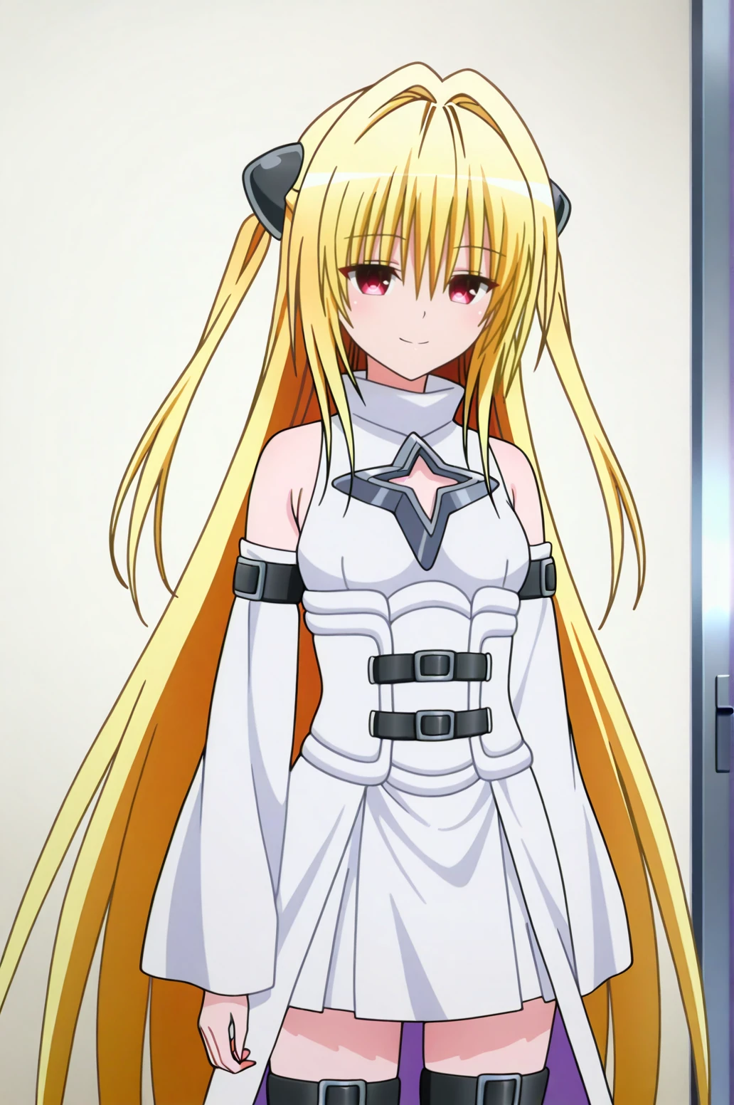 1girl, konjiki no yami, to love-ru darkness, red eyes, blonde hair, hair ornament, two side up,outfit 1 (Black Battle Dress):
