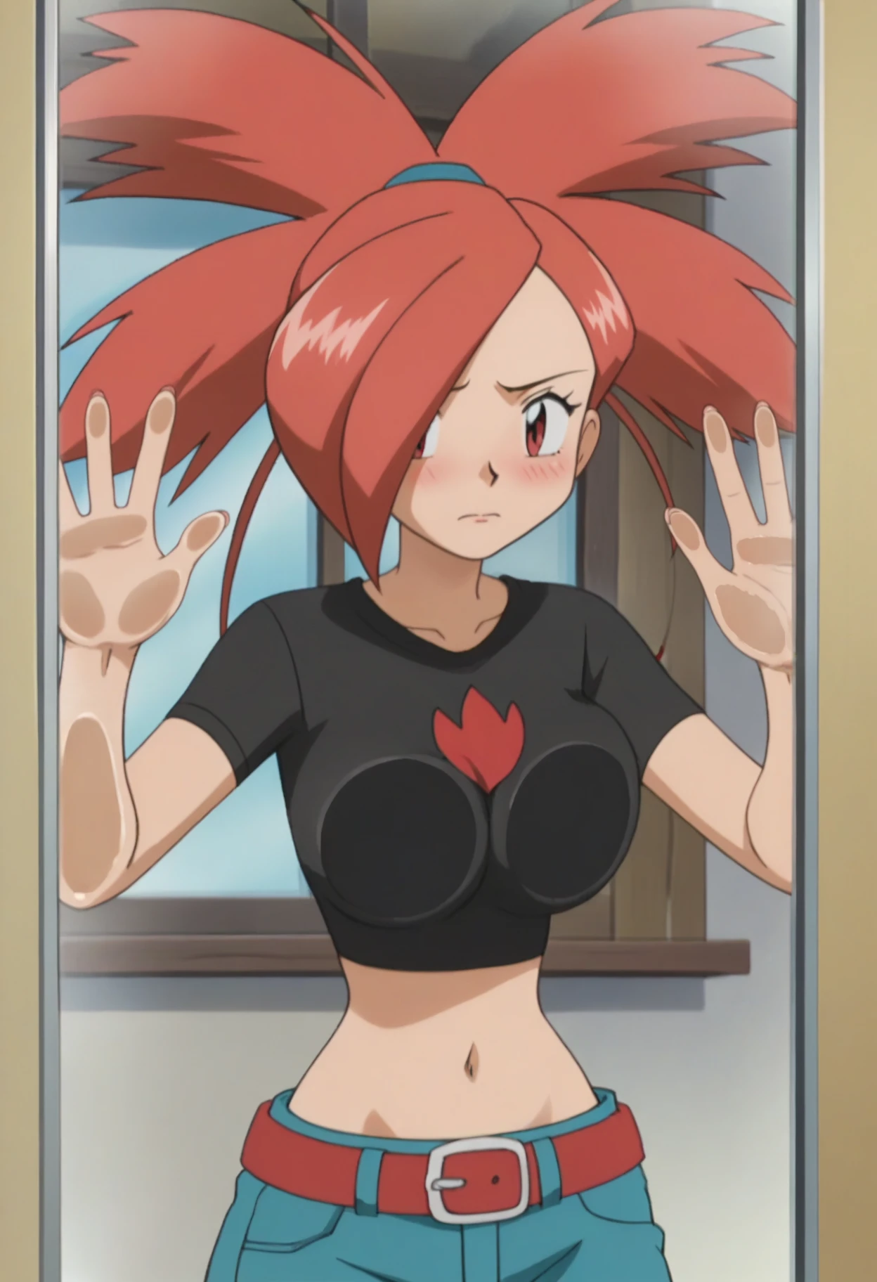 PMFlannery, red eyes, red hair, bangs, hair over one eye, ponytail, hair tie, breasts,