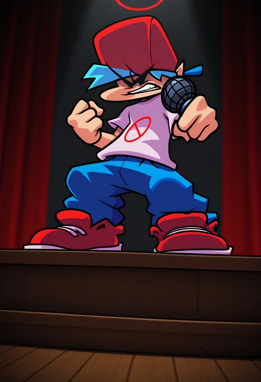 Boyfriend FNF, blue hair, solid black eyes, black sclera, no pupils, red hat, white shirt with red circle on it, blue pants, red shoes, holding microphone