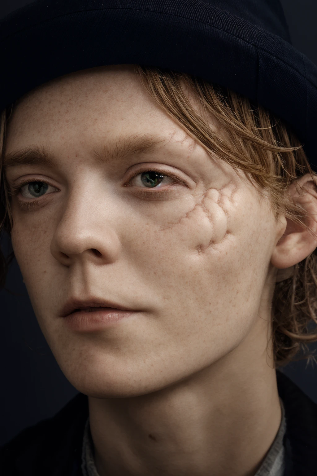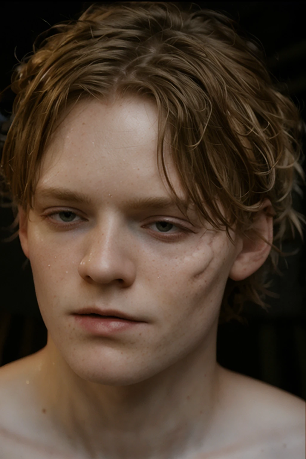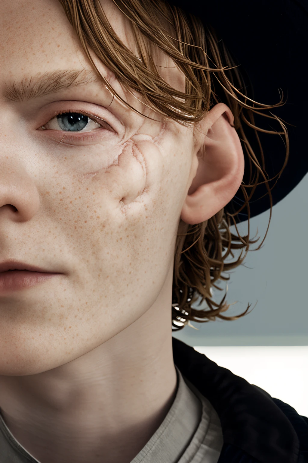 Promt example: Krester, blond, men with scar on his cheekbone, solo,short hair,brown hair,shirt,1boy,hat,jacket,upper body,male focus,collared shirt,black jacket,black headwear,scar,looking up,freckles,realistic,horror (theme)