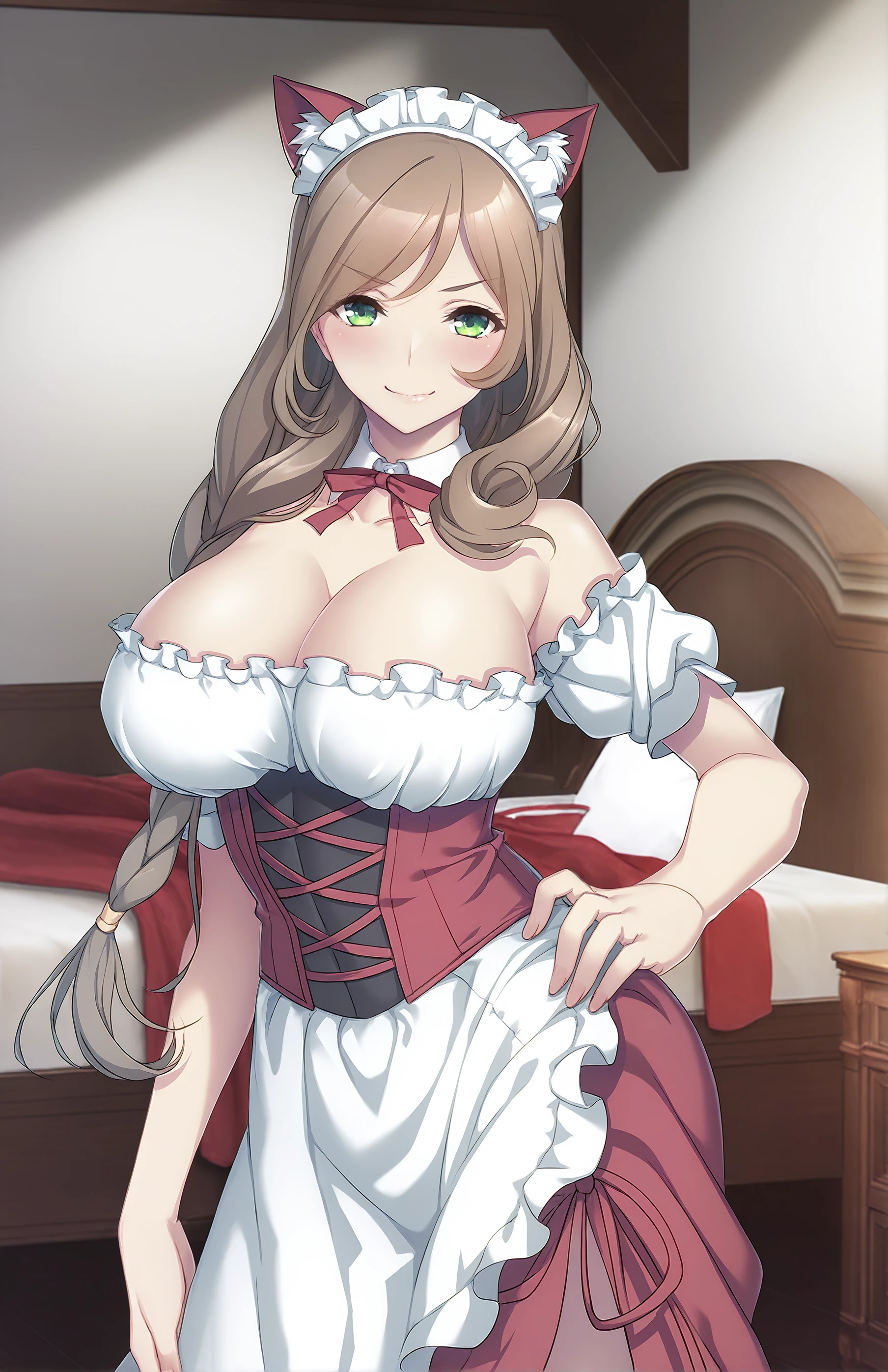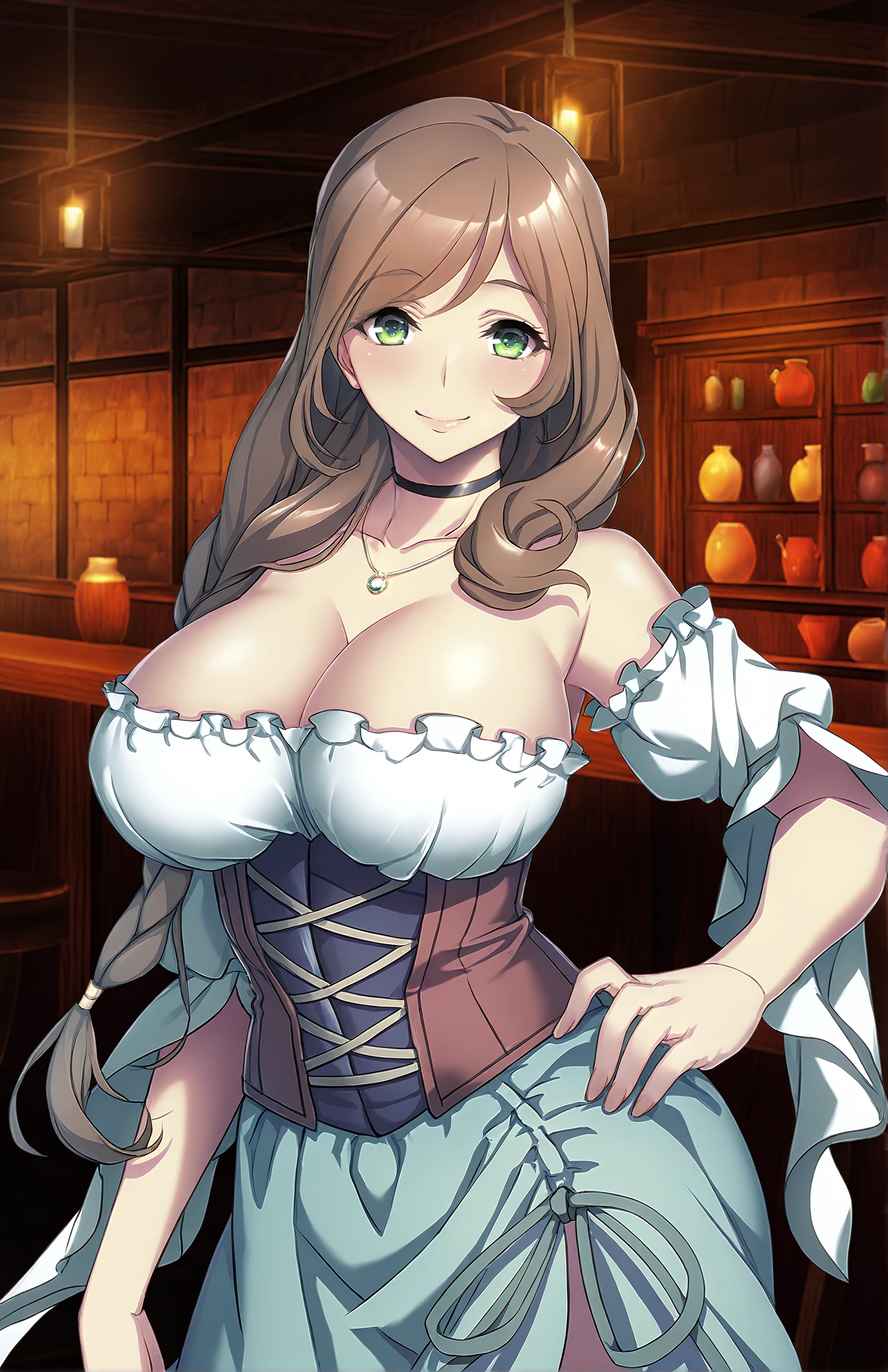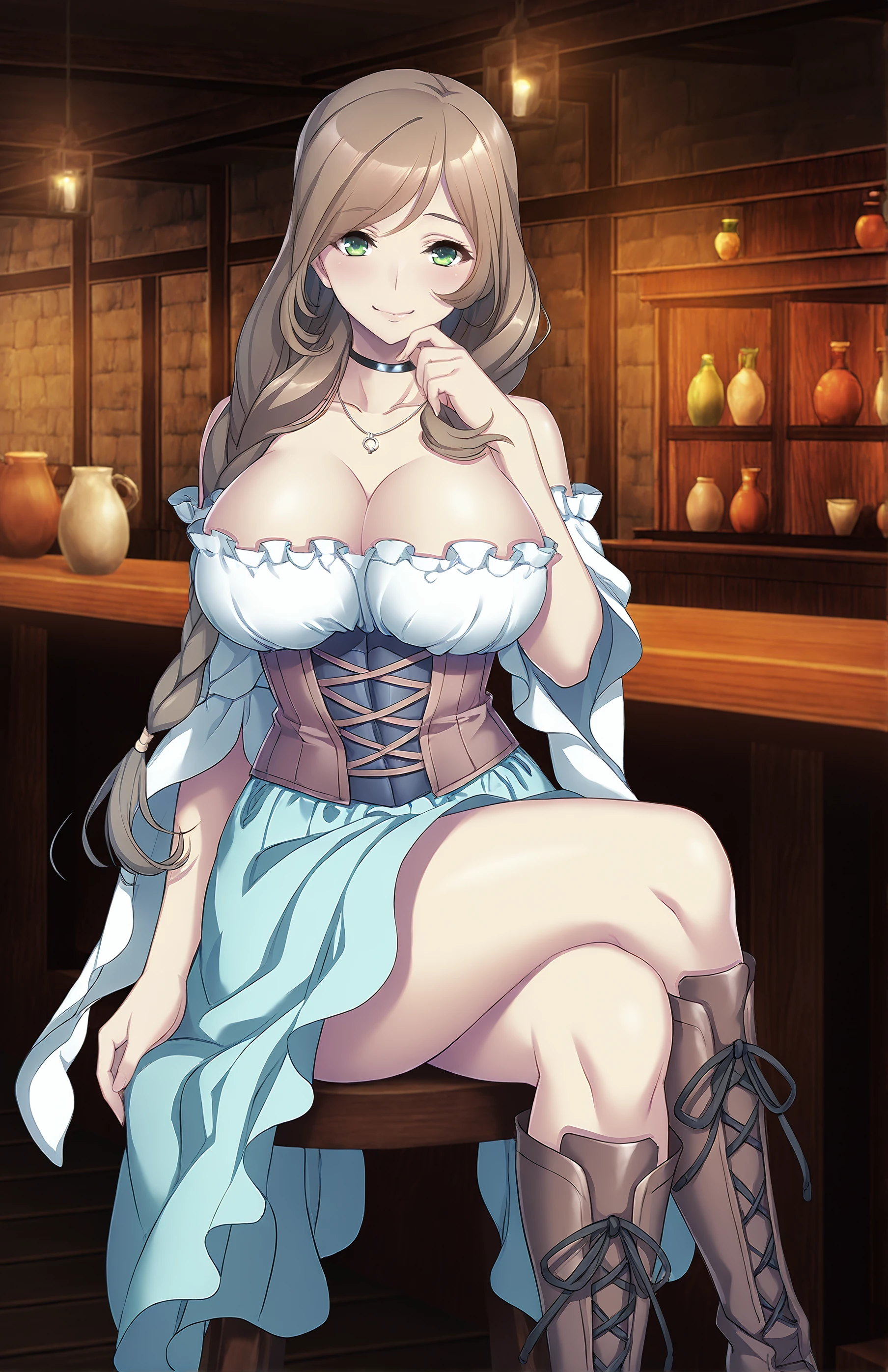 Lora for Sarashina Chihiro, from Isekai Enkou. Recommended weight: 0.9. Trigger word: SarashinaChihiro. Prompt for casual outfit: skirt, cleavage, bare shoulders, jewelry, collarbone, detached sleeves, choker, necklace, blue skirt, corset, knee boots, cross-laced footwear, lace-up boots. Negative prompt for NSFW: censored.