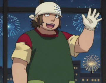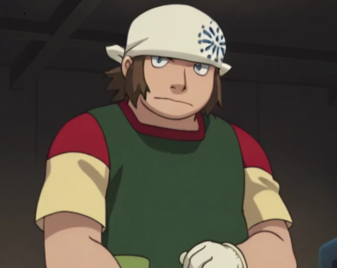 Prompts: male, fat, brown hair, grey eyes, bandana, yellow shirt, short sleeves, apron, green pants, boots, white gloves, indoors (sliding doors/factory)