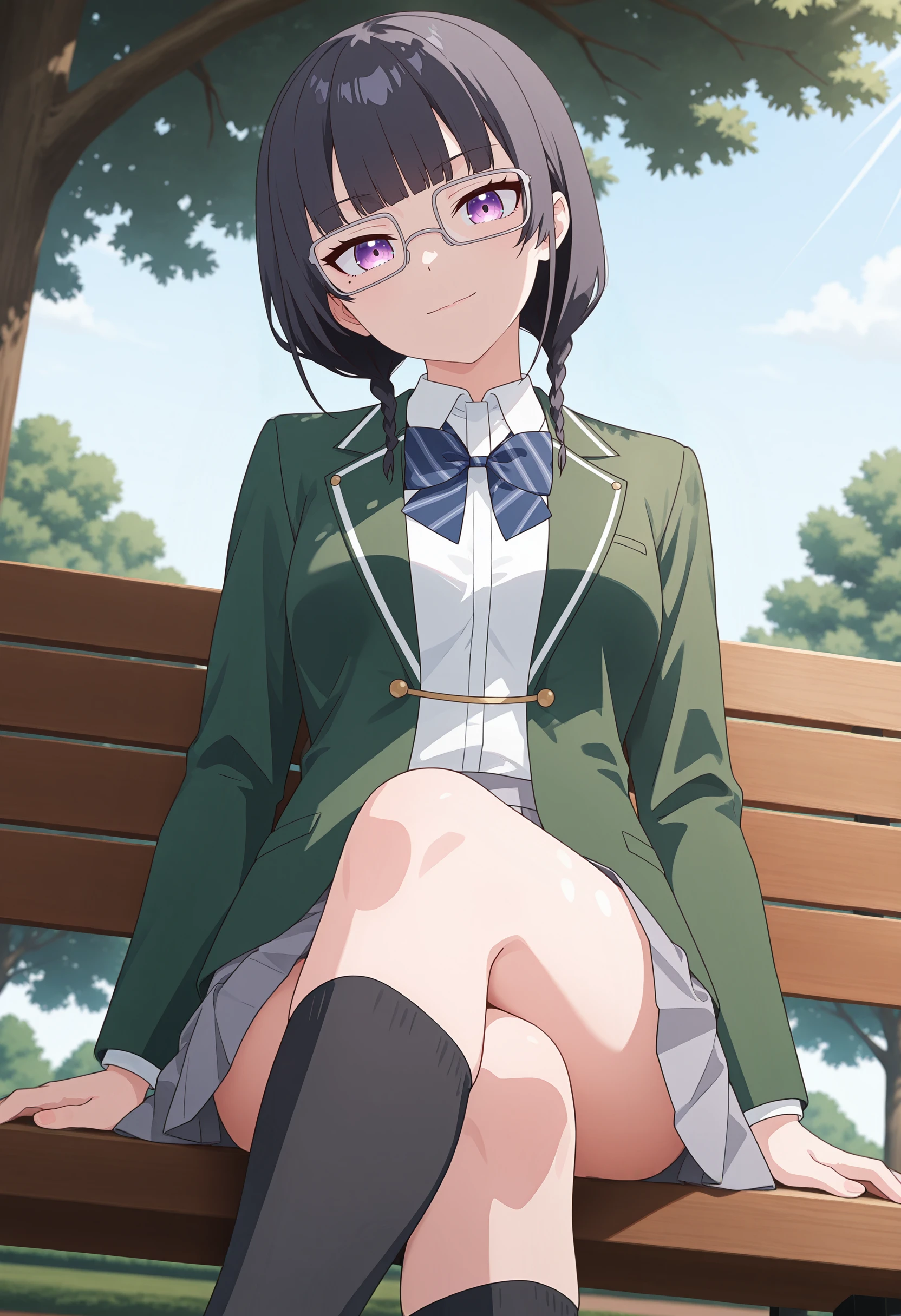 #2: grey-framed eyewear, rectangular eyewear, blue striped bowtie, green jacket, white shirt, long sleeves, grey skirt, pleated skirt, black kneehighs, brown penny loafers