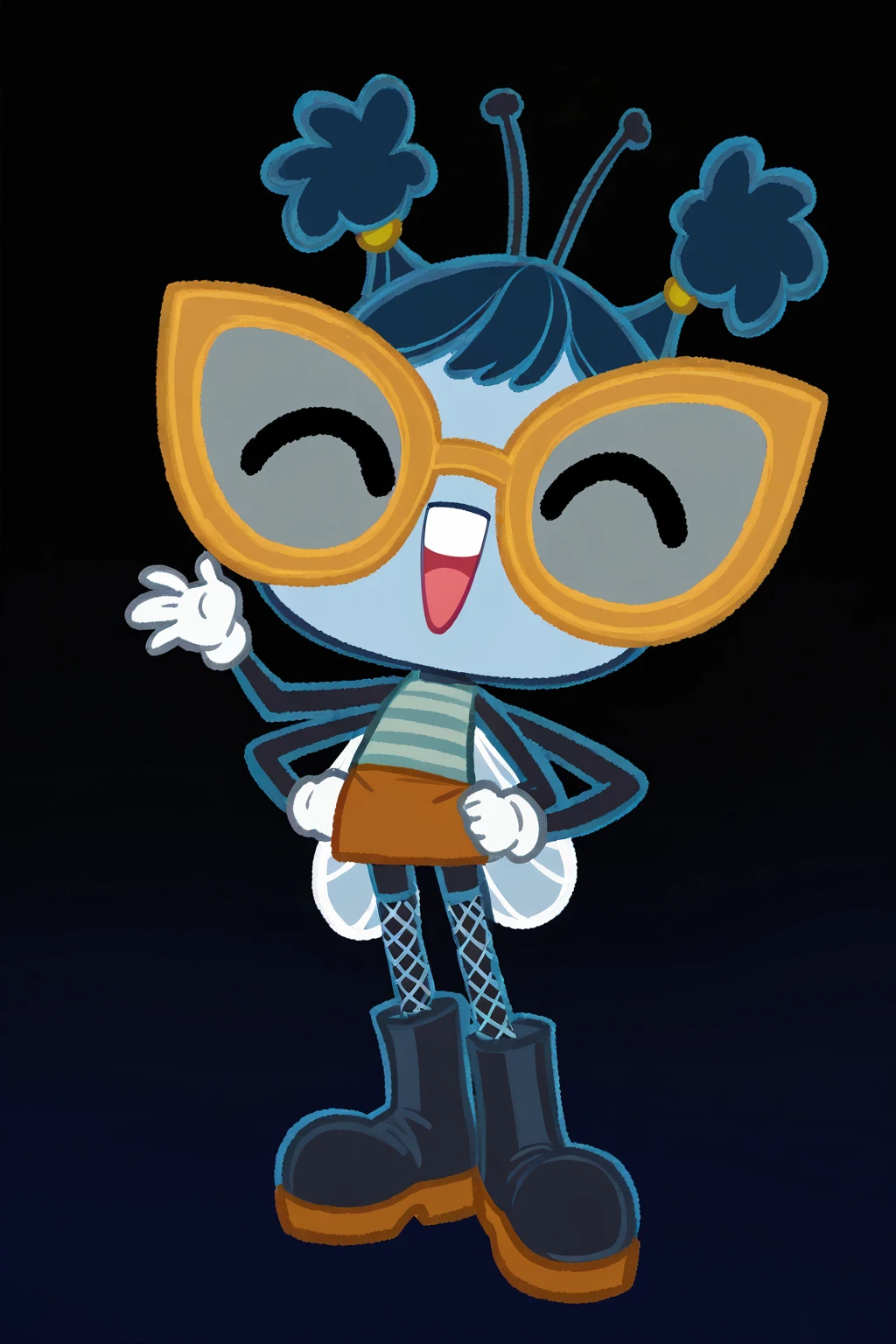 anthro, insect girl, antennae_(anatomy), glasses, twin buns, hair ties, multiple arms, four arms, top, wings, transparent wings, white gloves, fishnets, boots, skirt