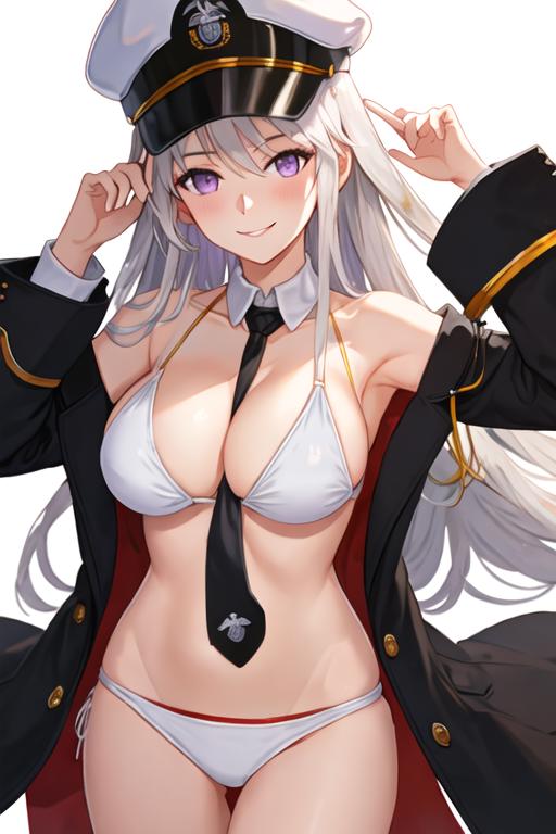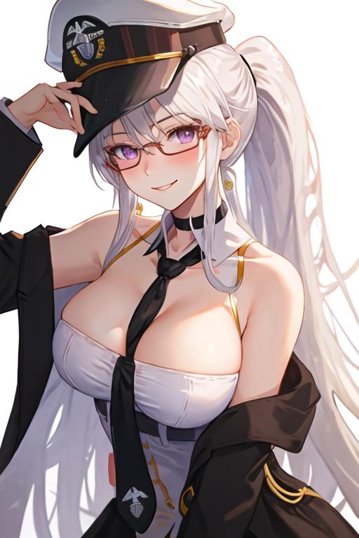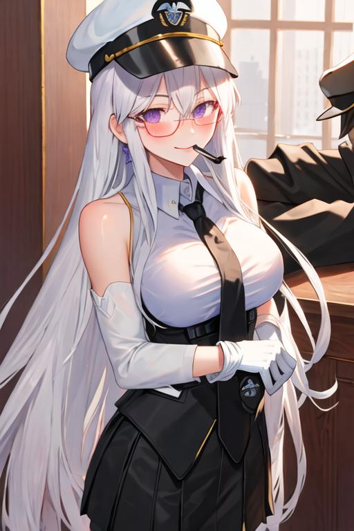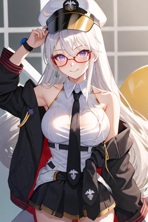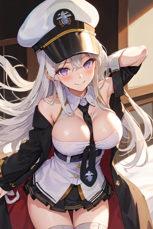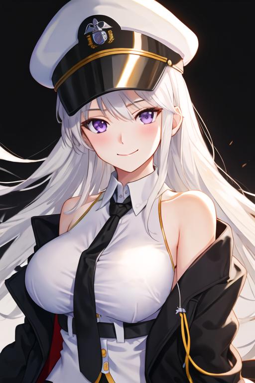 The trigger word is enterprise_azurlane, and the recommended tags are masterpiece, best quality, highres, solo, {enterprise_azurlane:1.10}, long_hair, purple_eyes, breasts, white_hair, large_breasts, hat, bangs, very_long_hair, necktie, sleeveless, peaked_cap, black_necktie, white_headwear, smile.