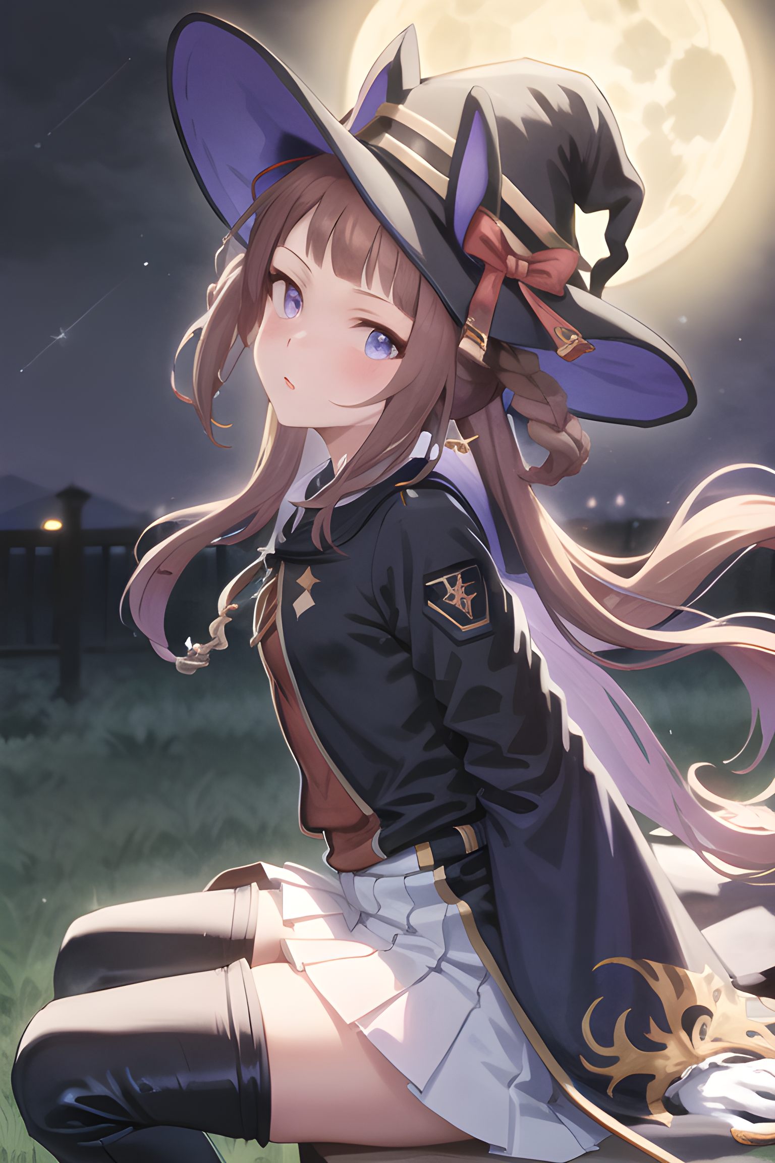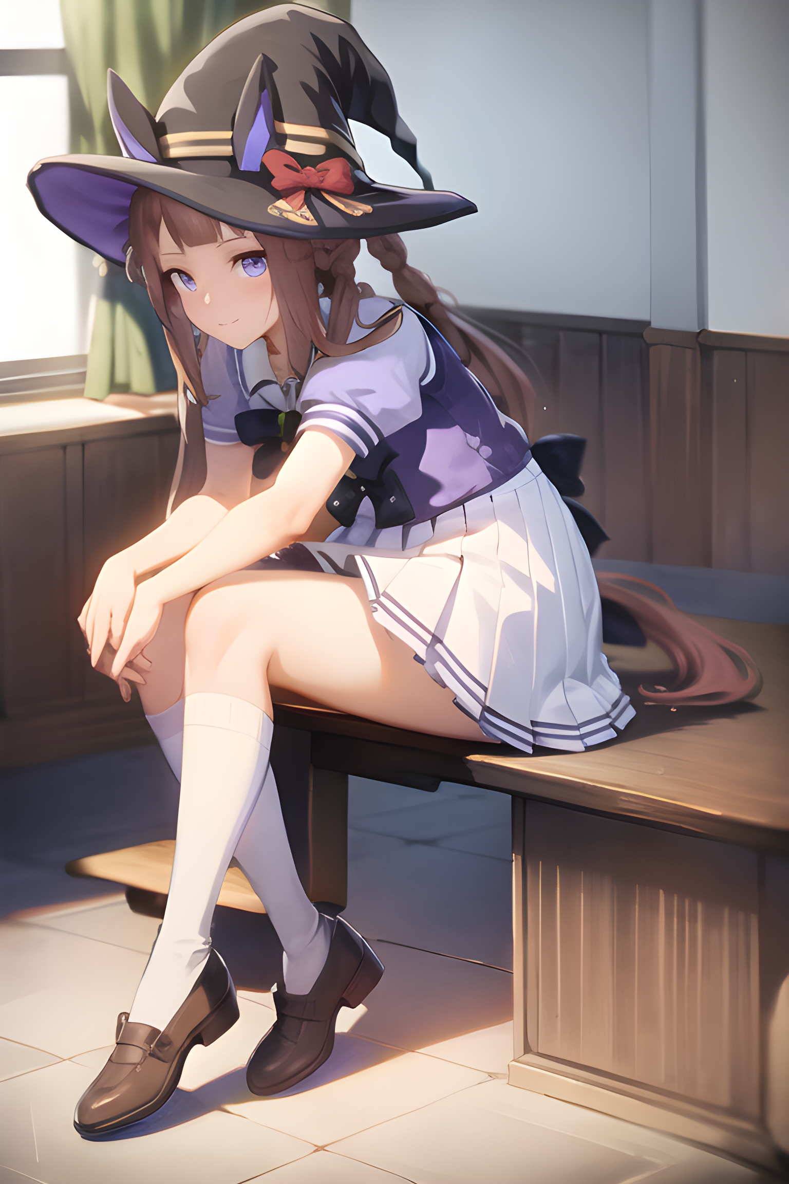 sweep tosho \(umamusume\), natsufuku, witch hat, very long hair, twintails, hair rings, pleated skirt, puffy short sleeves, purple bow, white skirt, sailor collar, sailor shirt, tracen school uniform, white thighhighs, brown footwearCasual Wear