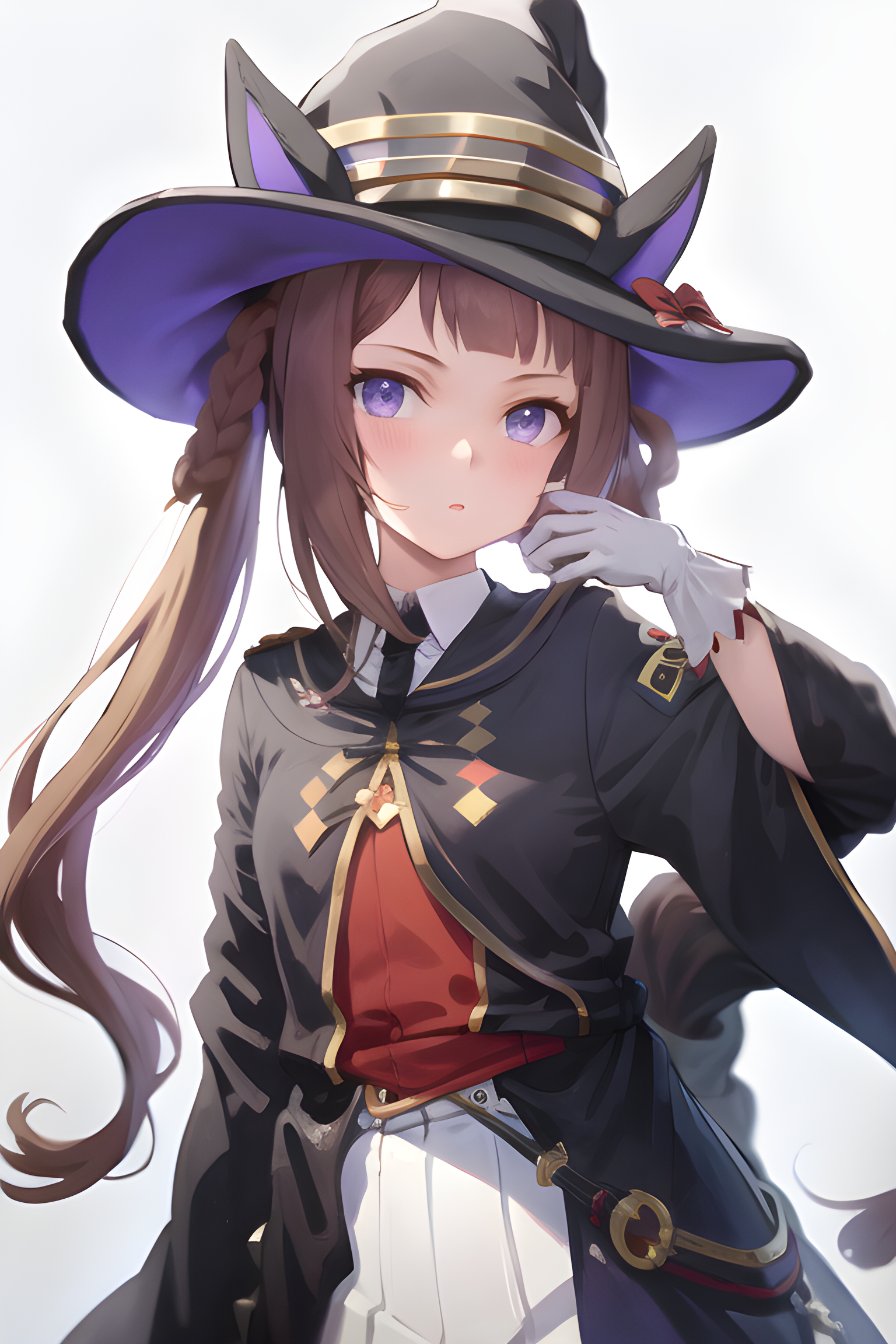 sweep tosho \(umamusume\), shobufuku, witch hat, twintails, hair rings, very long hair, black robe, white gloves, wide sleeves, white skirt, thigh bootsSchool Uniform