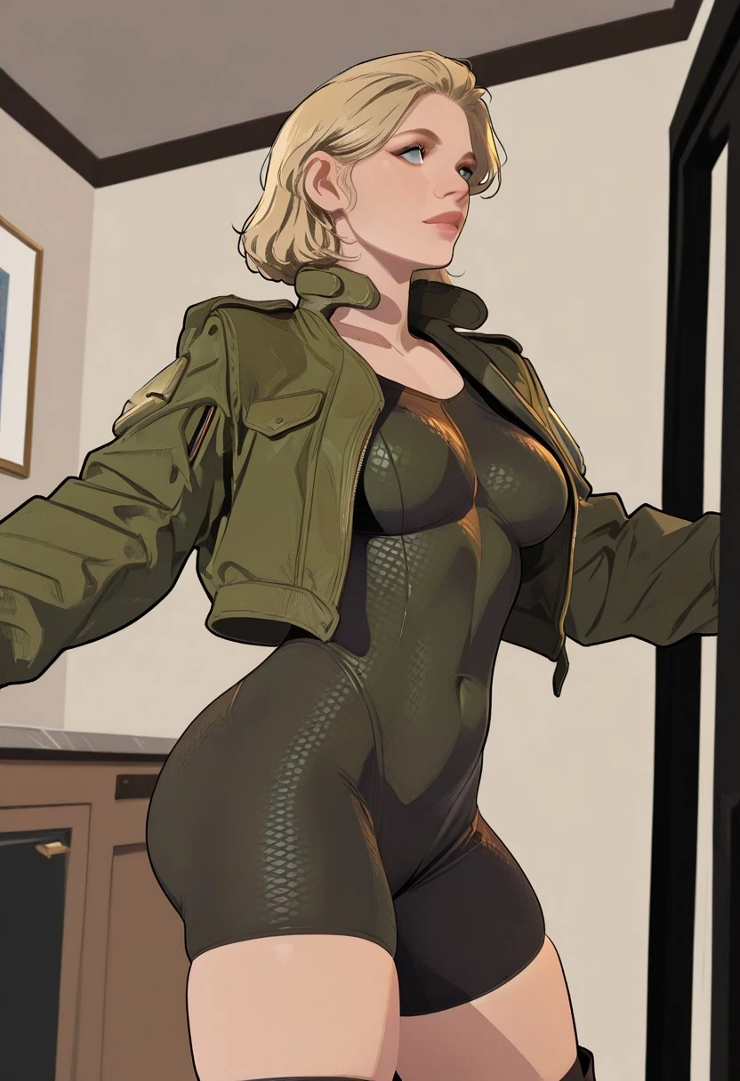 Ines_Hound, blue eyes, short blonde hair, lips, upper back armor, green cropped jacket, military jacket, skin tight carbon fibre bodysuit, breasts, navel, fit female, high heel boots, visible belly button, bubble butt,