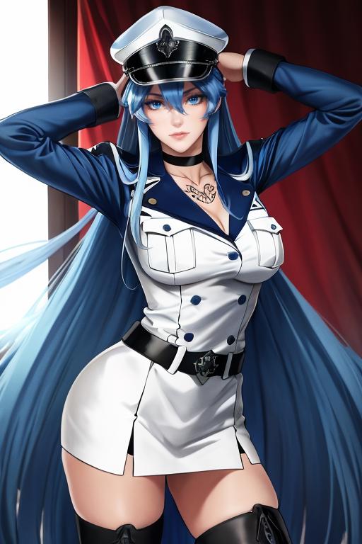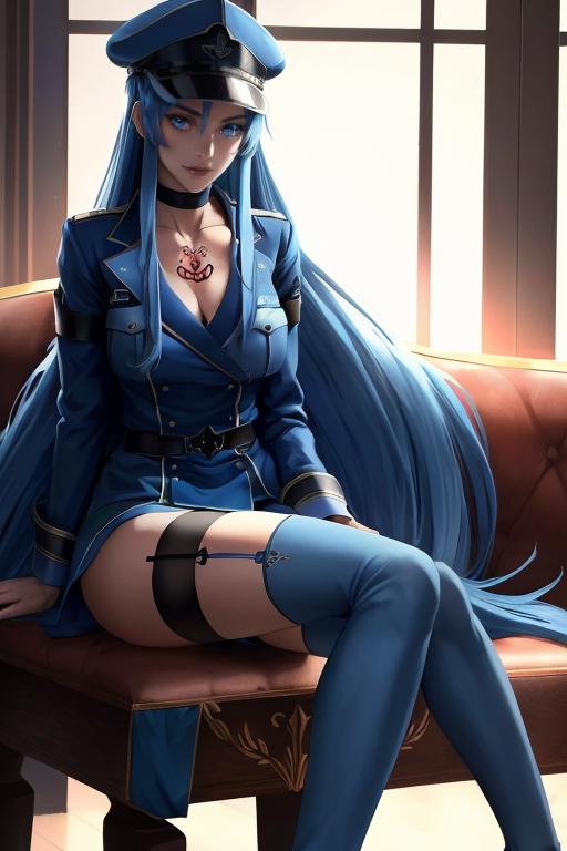 long_hair,hat,peaked_cap,blue_eyes,blue_hair,choker,very_long_hair,military_uniform,thighhighs,tattoo